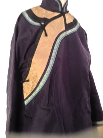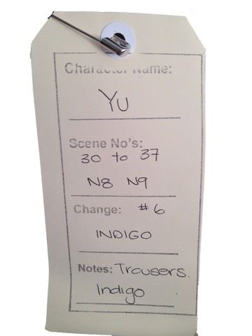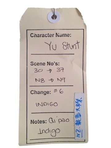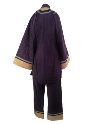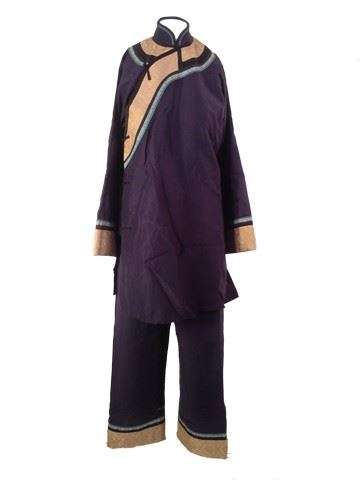 Yu (Michelle Yeoh) screen worn indigo with beige trim pant suit, made of silk with buttons up the side and elastic waist band pants. Top is labeled "hero" and trousers labeled "stunt". Used in the fight scene, scenes 30 to 37. Includes wardrobe tag.
