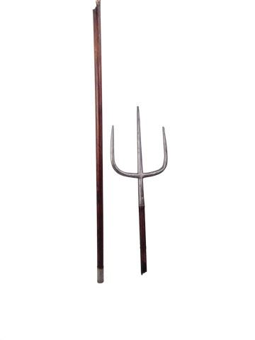 Screen used, stunt, fork spear made of rubber and aluminum. Shaped like a pitch fork with a blunt end and a wooden handle that has been broken during production. Spear is in two pieces and used for fighting scenes.(76x2)