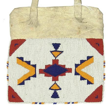 Circa Mid/Late 1900s, Small buckskin bag with handle and fully beaded front panel containing traditional geometric symbols. Very good condition. 7" x 7" + strap