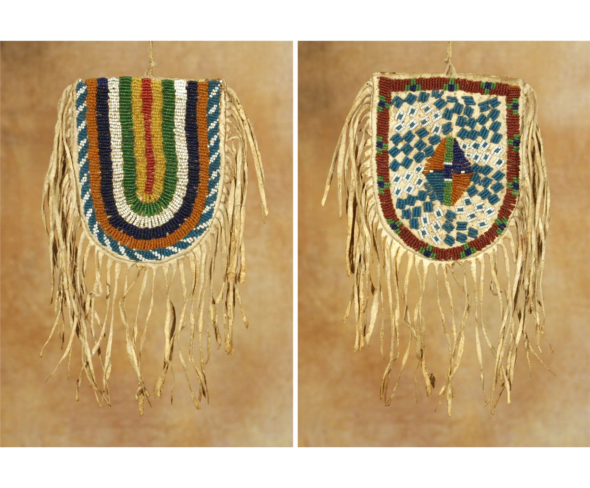 Crow Bag. 5.5" x 4.25" with 4" of fringe all around. Fabulous beaded designs are different on each side. Circa 1890.