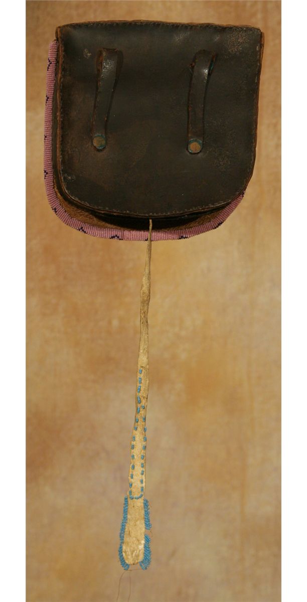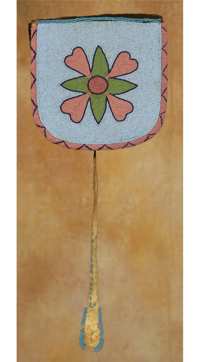 Crow Bag. 7.25" x 7.5" commercial leather bag. The front flap is completely covered in beadwork. A single flower design, beaded in colors of rose, pale green and three shades of blue. 11.5" beaded hide drop. 19th century.