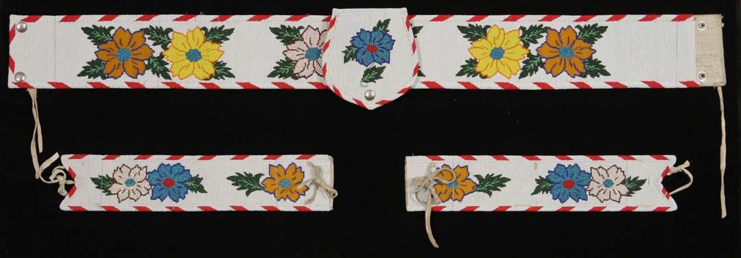 Crow Beaded Belt & Cuffs. 40" x 5" Belt. 14 ½" x 3" Cuffs . Cased in a shadowbox frame. Circa 1930s. (est $600-900). For condition reports please visit: www.auctioninsantafe.com/cr2011.pdf
