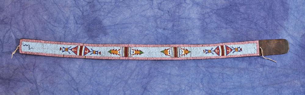 41” x 2 1/4” harness leather belt with beaded panel featuring human figures, lodges, and trees. Classic pink beads on edges, deep reds, blues, and greens on a light blue background. c. 1900.