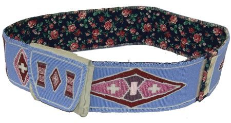 Ca. 1970s, Beautiful fully beaded traditional wide belt with sliding matching flap bag that moves to cover the snap closure like a buckle. Very good condition. Great colors! 43" x 3-1/2"