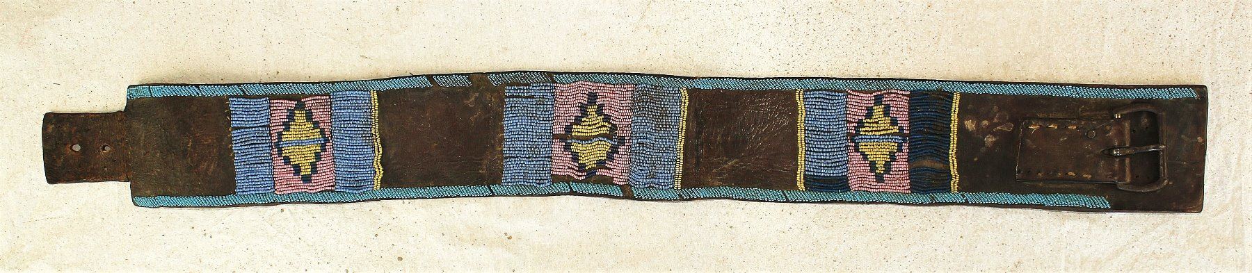 Early Crow beaded belt on heavy harness leather containing greasy yellows and robin egg blues measuring 3 1/2" x 31".