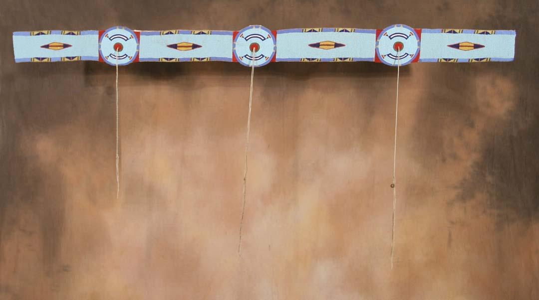 Crow Beaded Blanket Strip. 66 ½" x 6". With red trade wool, three tassels - two outer tassels are twisted. Mounted & ready to hang!. 19th century. (est $25,000-30,000). For condition reports please visit: www.auctioninsantafe.com/cr2011.pdf