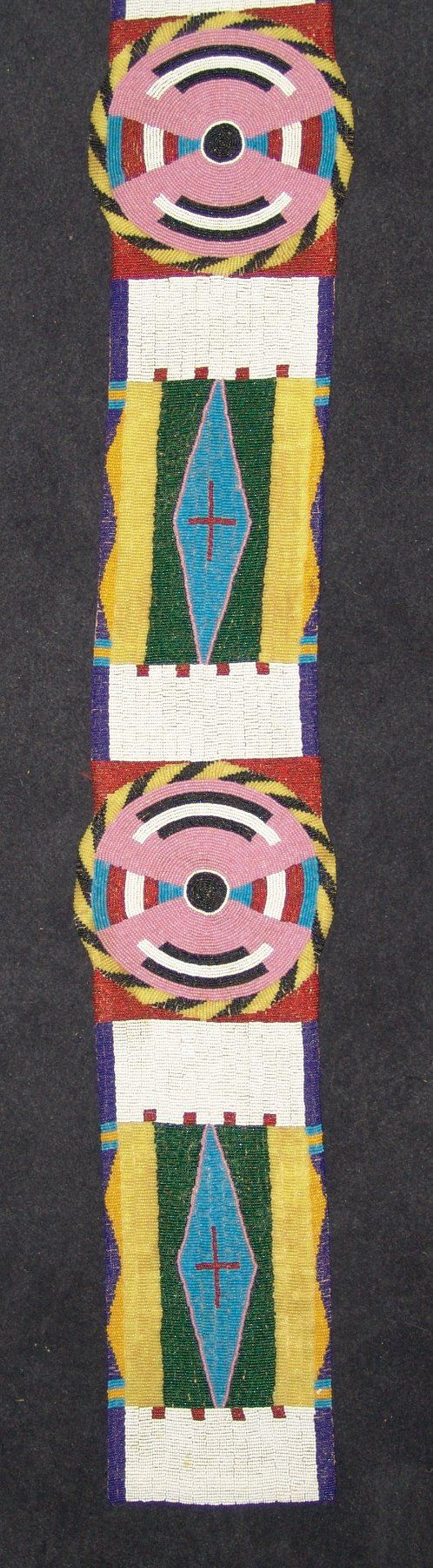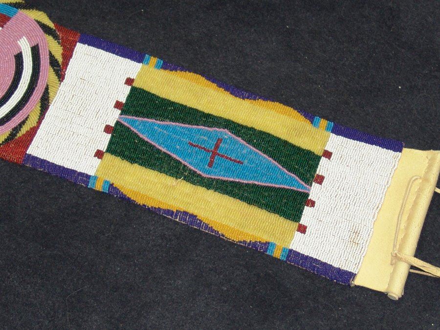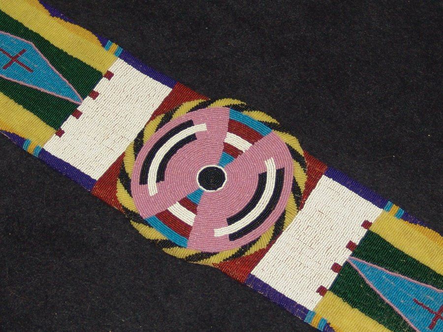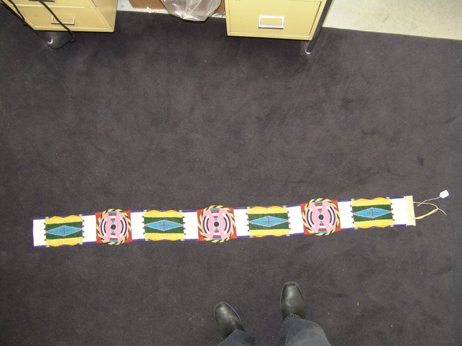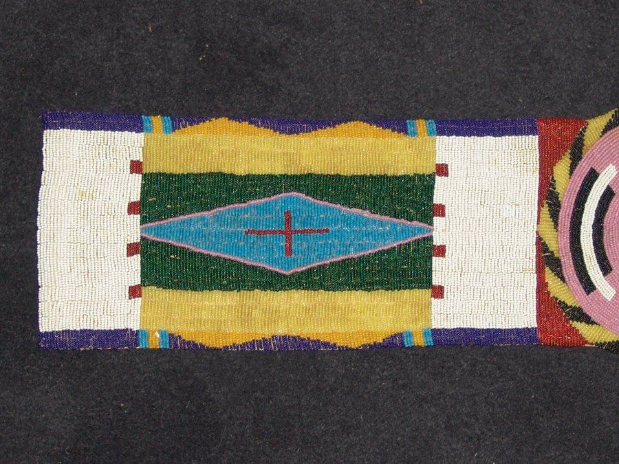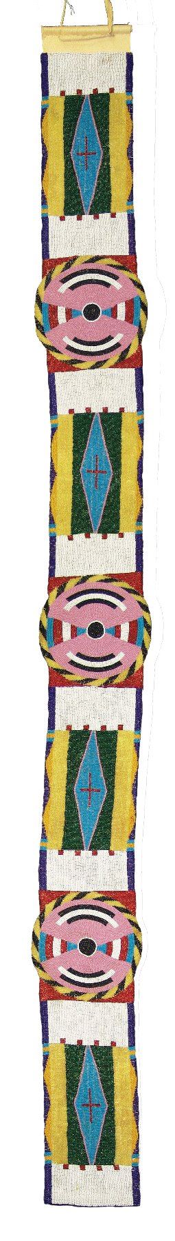 Large amazing fully beaded 6" wide traditional blanket strip with three larger 7" rosette sections done in traditional patterns, all done in flat and lazy stitch beading on native tanned buckskin. Excellent,Ca. 1970s-1980s,72" x 7"