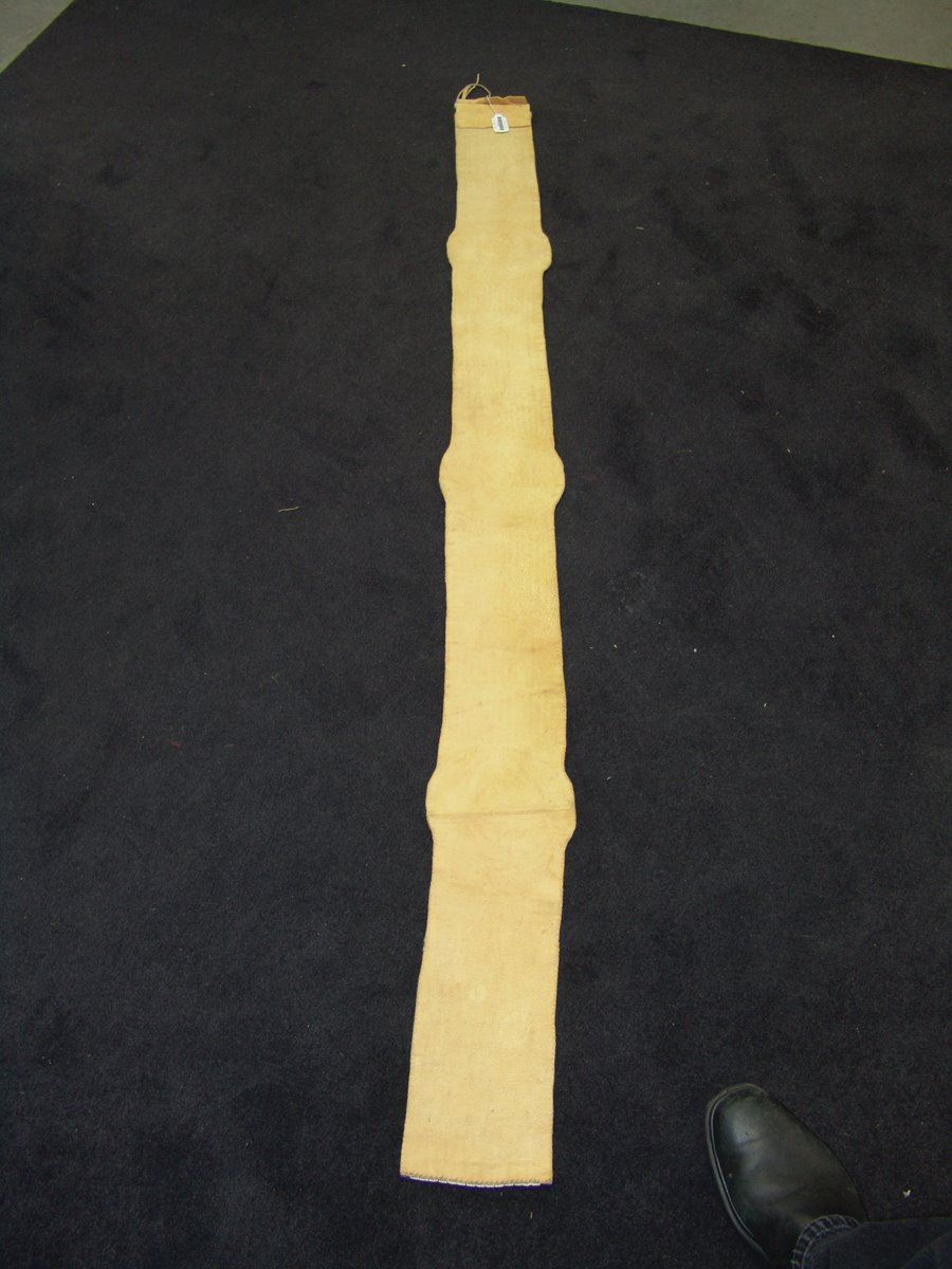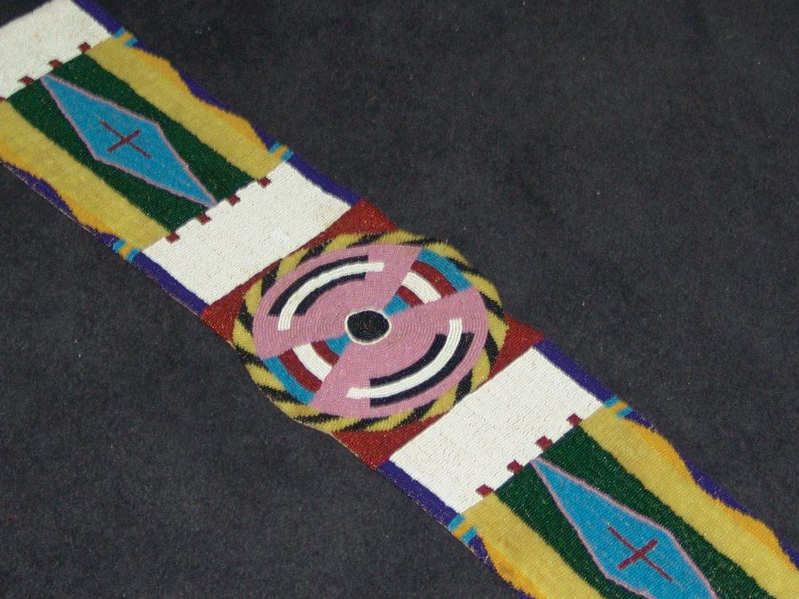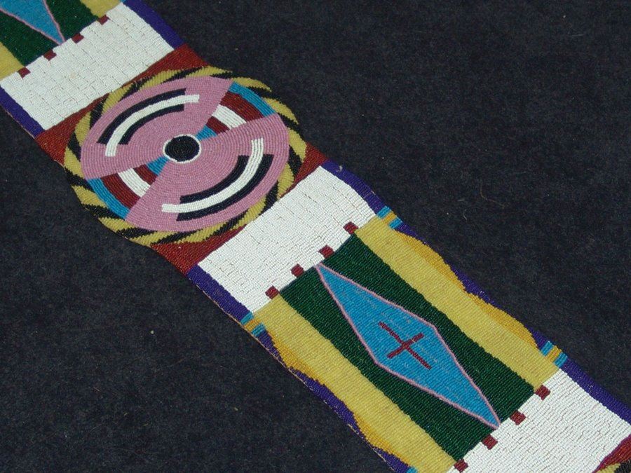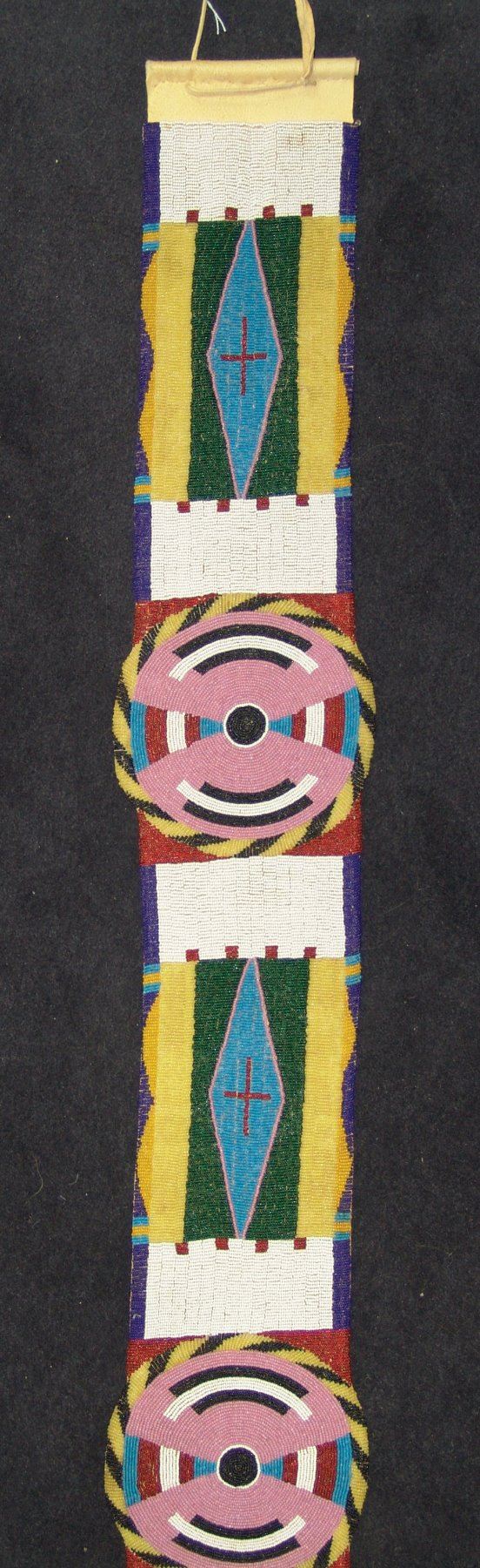 Large amazing fully beaded 6" wide traditional blanket strip with three larger 7" rosette sections done in traditional patterns, all done in flat and lazy stitch beading on native tanned buckskin. Excellent,Ca. 1970s-1980s,72" x 7"