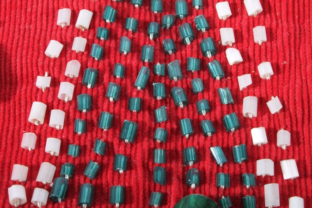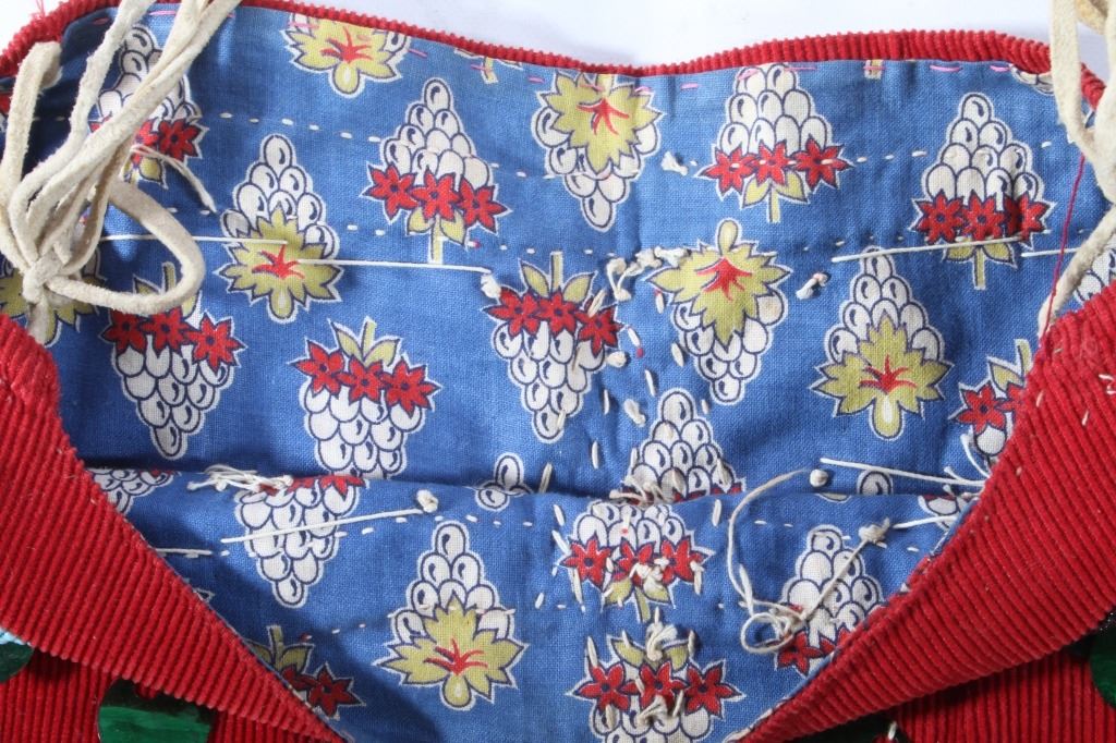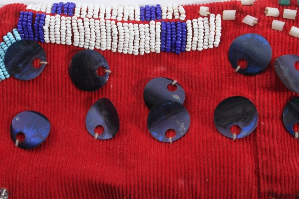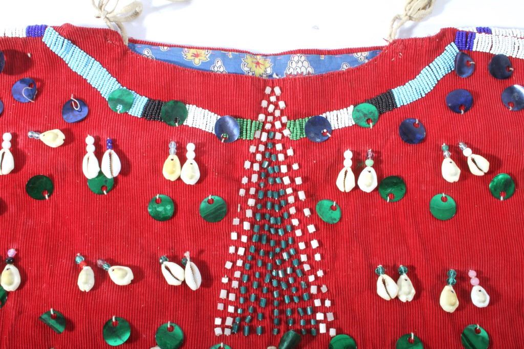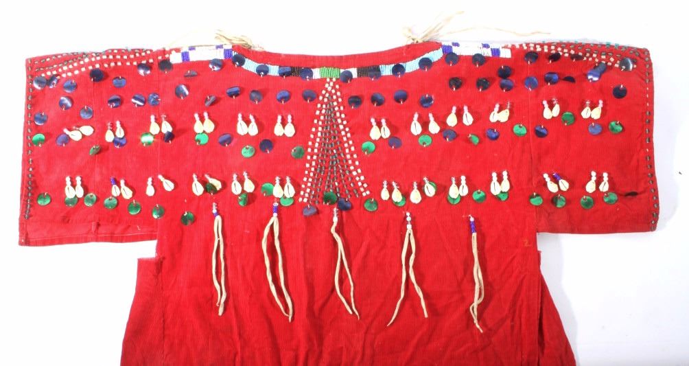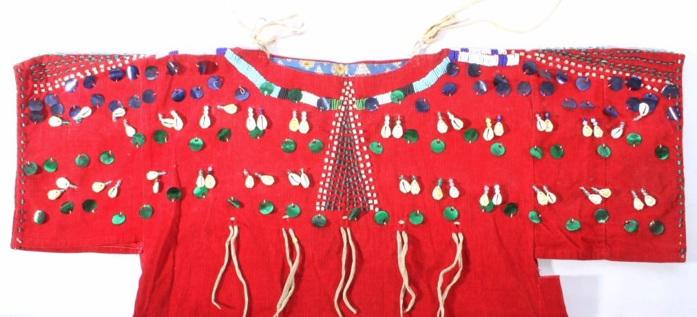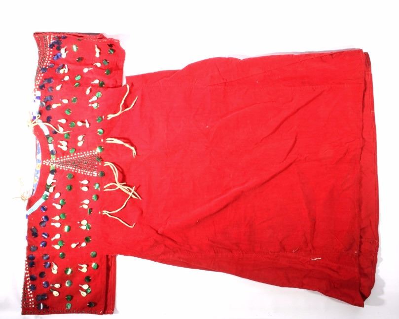 This is a Crow Native American Indian beaded dress from circa 1920-1930's. The dress is constructed of a early red trade clothe and shows early glass trade seed beadwork along the collar and shoulders in chalk white, blue, sky blue, black, and medium green. The piece aslo shows sacred Cowrie (or Cowry) shells with various glass trade beads. Provenance: This is from a large Native American & Early American artifact private collection in Iowa. The outer edge and center of the chest has excellent glass tube cut beads. The piece is in overall good condition. Measures 45"L x 37"W at the arms and 39"W at the skirt.