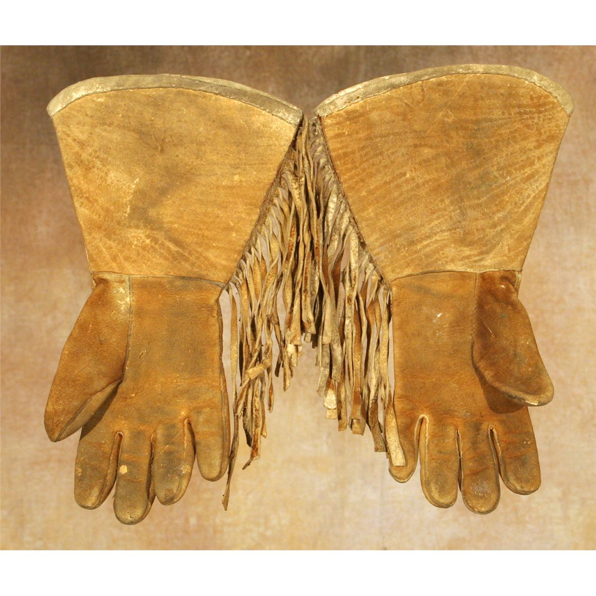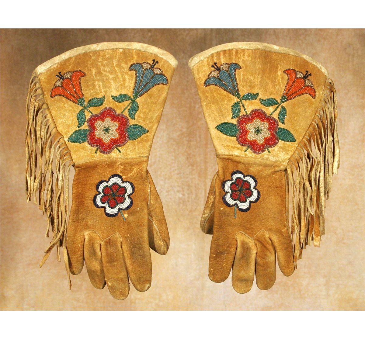 Crow Gauntlets. 14" x 8" with 5" fringe. Partially beaded floral design. Appear to be beaded commercial gloves lined with trade cloth. Circa 1920s. Provenance: Collection of Dr. Delwin and Karen Bokelman, PA., and pictured in their book Precious Dreams, page 45.