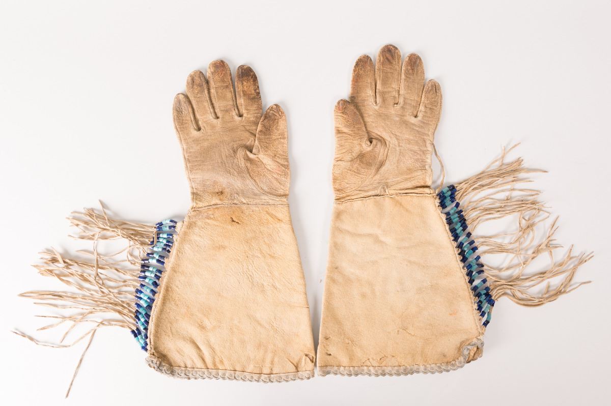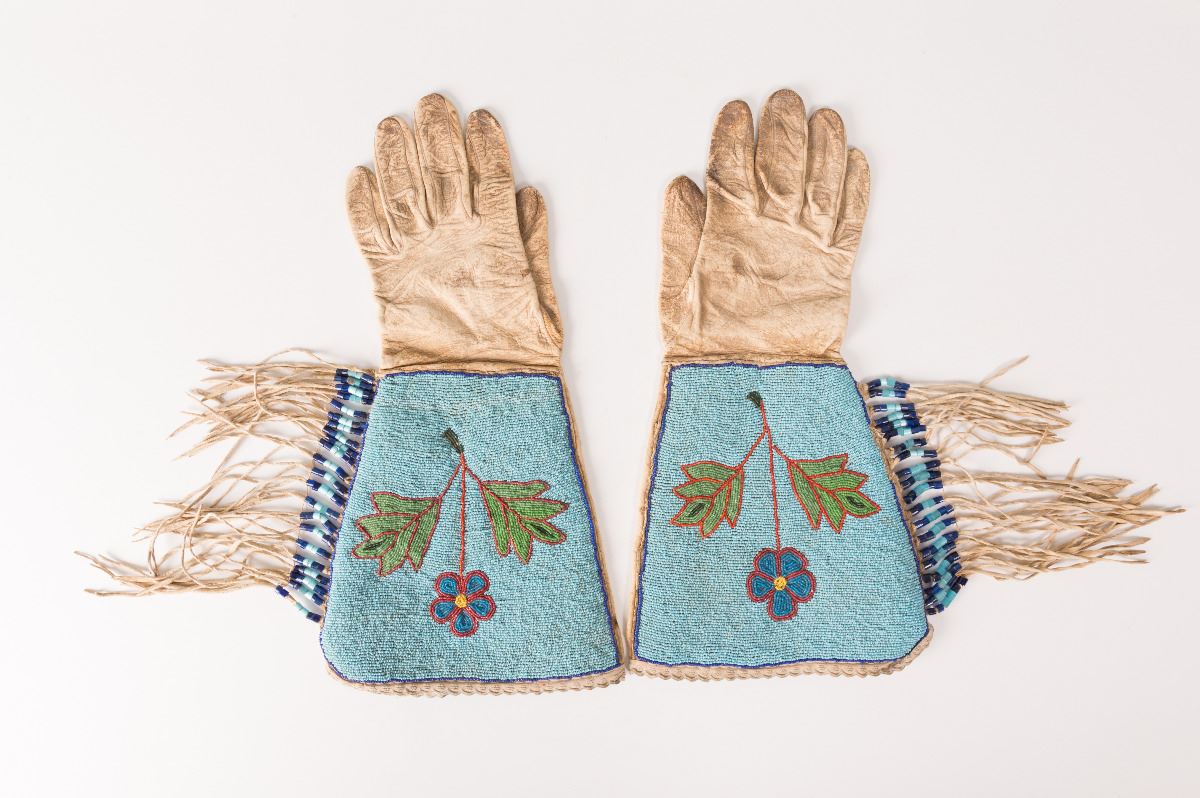 Crow Beaded Guantlets. 15" x 7 ½" with floral designs on a blue background, accented with trade beaded 4 ½" fringe and trimmed in a floral pattern trade cloth. Circa 1910.