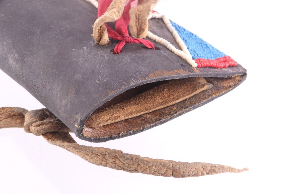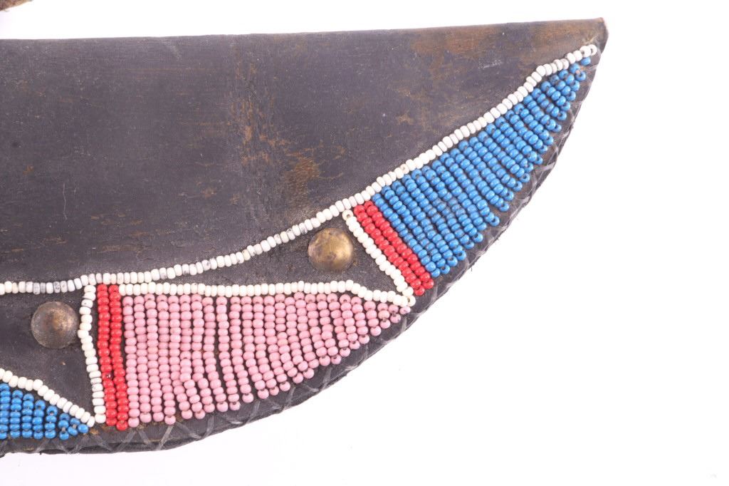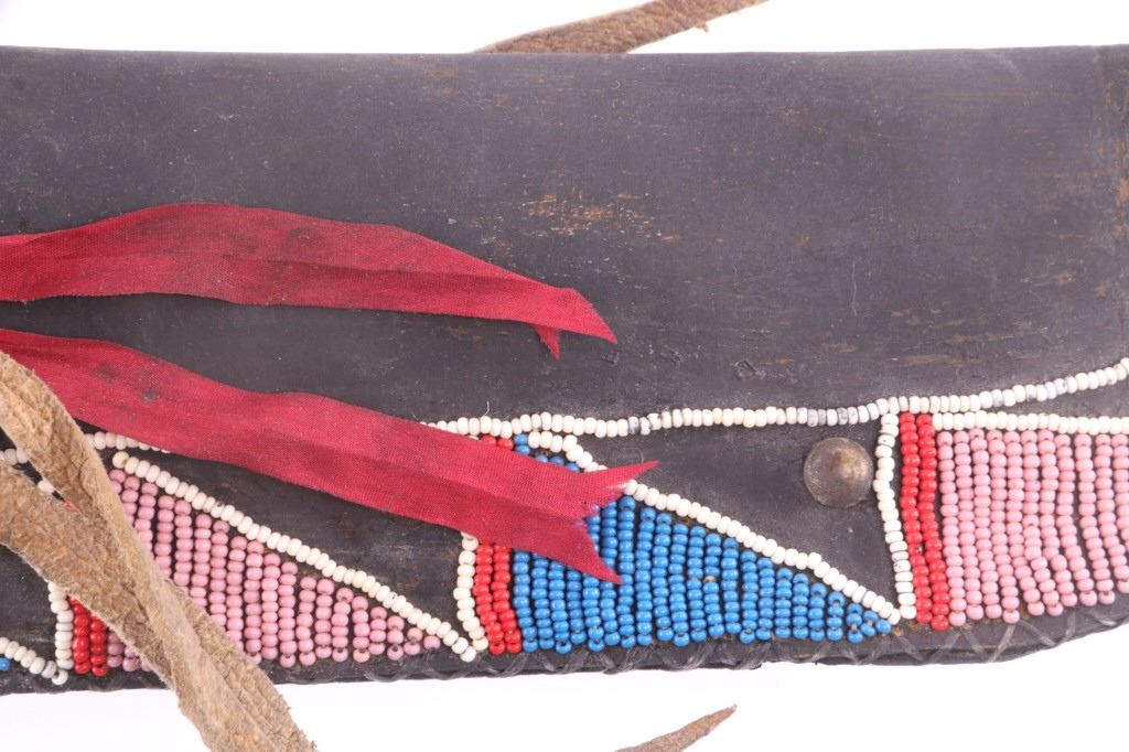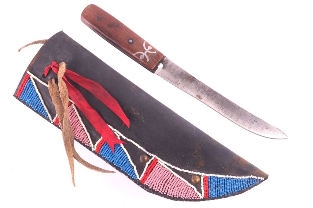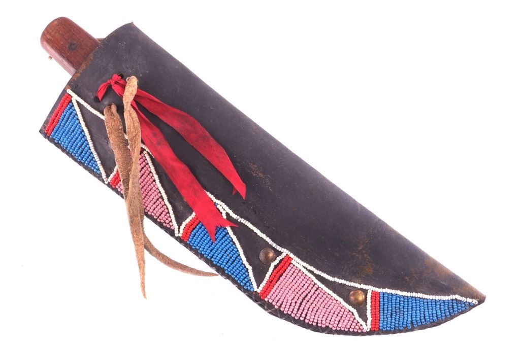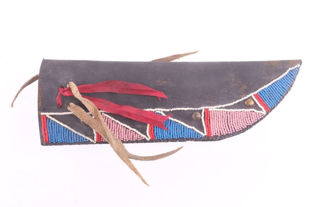 This is an exceptionally artful Crow Native American Indian beaded sheath and trade knife dating to the fourth quarter of the 19th Century. The sheath is constructed of thick, dark brown harness saddle trade leather remnants with beautifully beaded traditional geometric Crow designs all in old glass trade seed beads of colors of chalk white, Cheyenne pink, blue, and red. The geometric pattern has a zig zag pattern with open triangular sections and old brass trade tacks, totaling four. The front also shows Indian tanned hide ties/ fringe, along with a red trade cloth ribbon. The back of the sheath shows the same Indian tanned hide belt tie. The trade knife shows a typical skinning-like blade with hardwood, likely walnut, and a nice attractive pewter inlay. Overall, the knife measures 10 ½ inches long. Provenance: From the ex-collection of Dale Harrison of Ohio. The sheath measures overall 12 inches long by 4 inches wide.