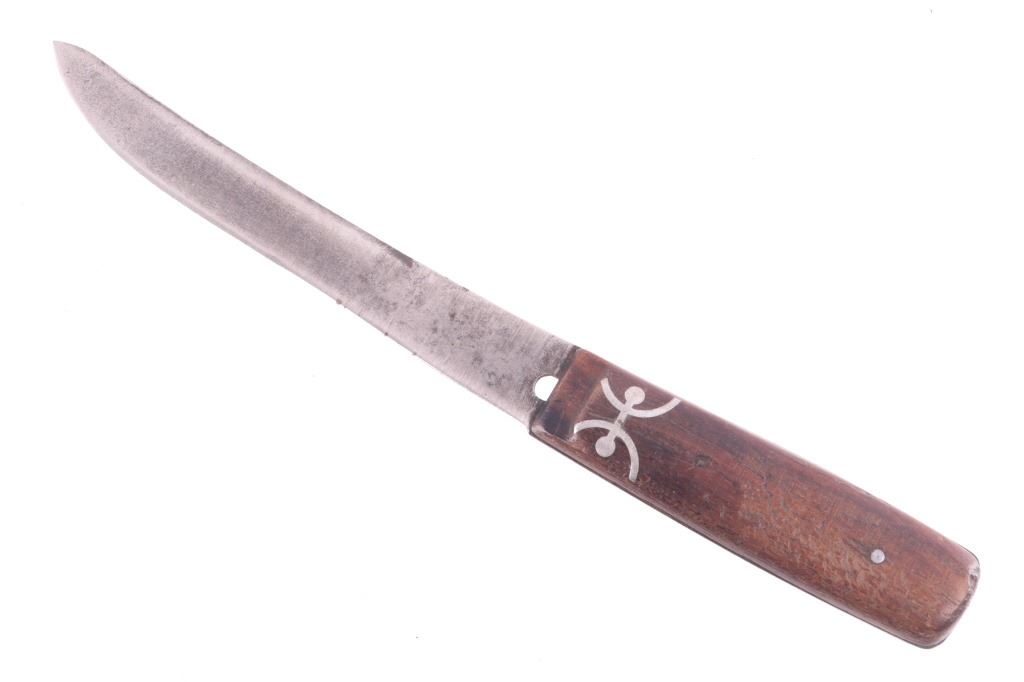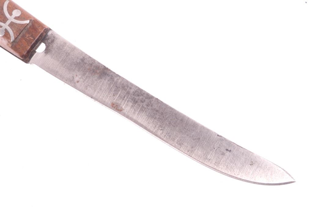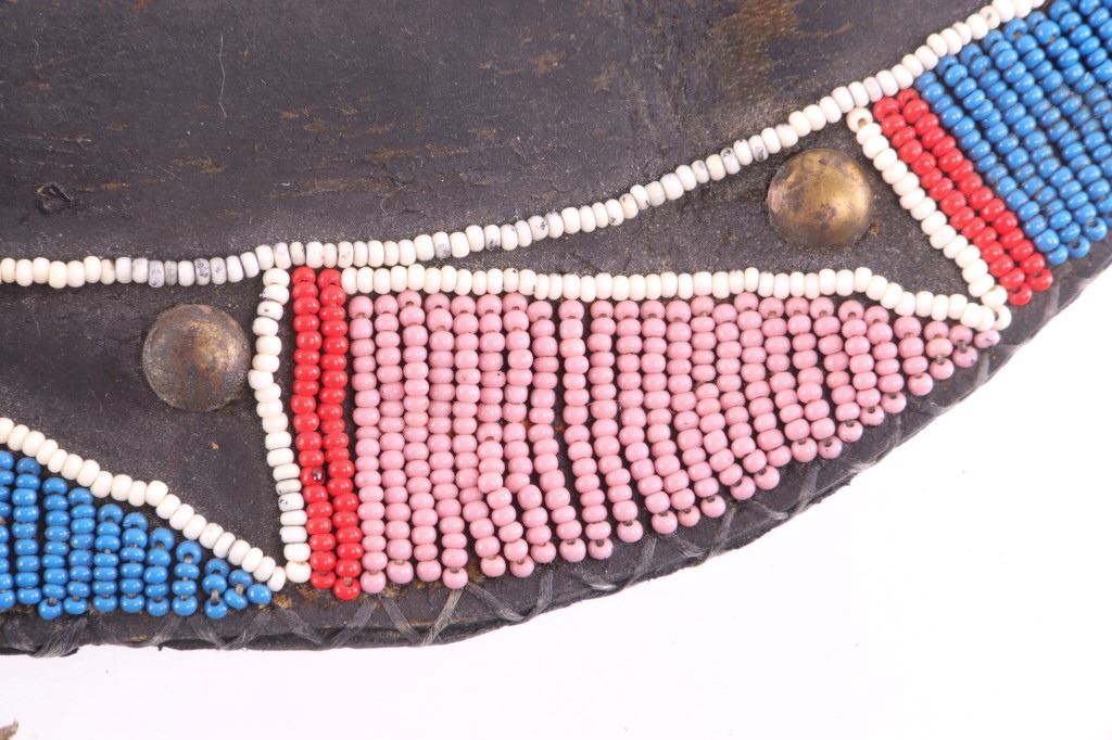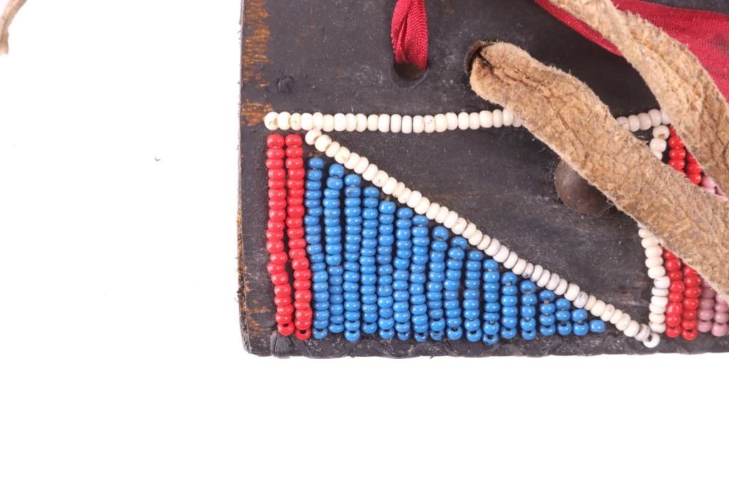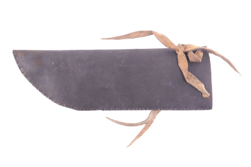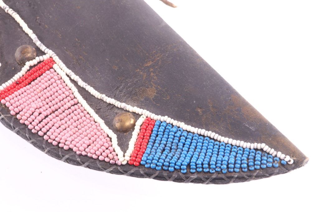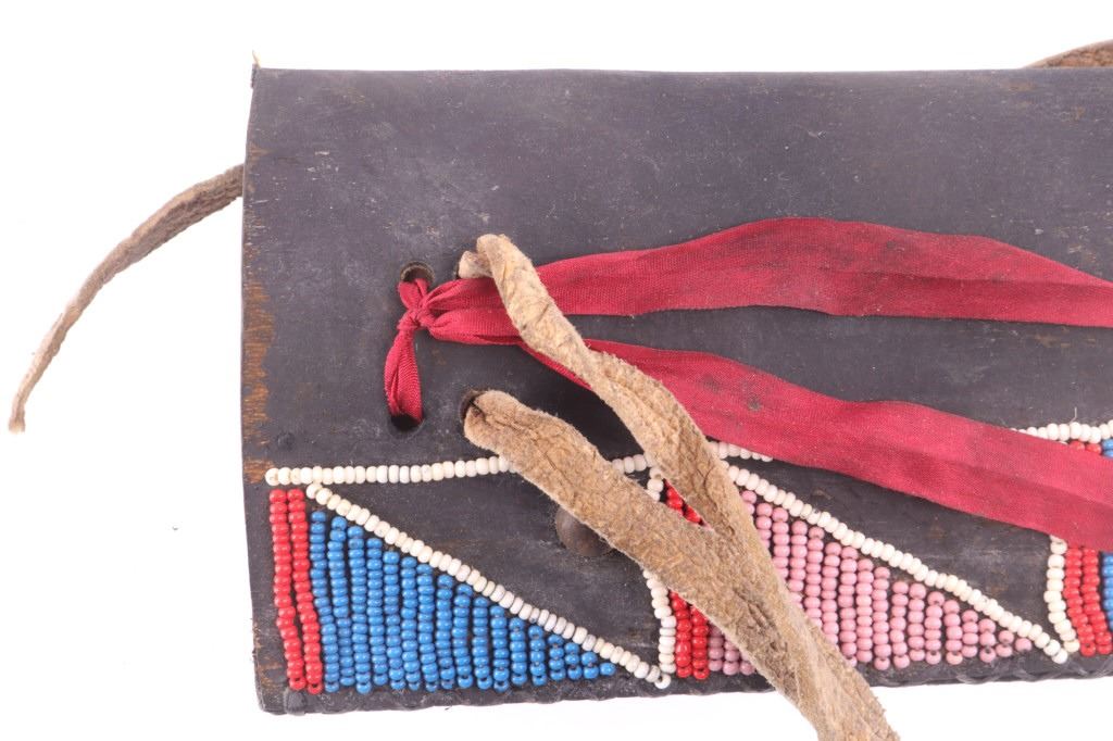 This is an exceptionally artful Crow Native American Indian beaded sheath and trade knife dating to the fourth quarter of the 19th Century. The sheath is constructed of thick, dark brown harness saddle trade leather remnants with beautifully beaded traditional geometric Crow designs all in old glass trade seed beads of colors of chalk white, Cheyenne pink, blue, and red. The geometric pattern has a zig zag pattern with open triangular sections and old brass trade tacks, totaling four. The front also shows Indian tanned hide ties/ fringe, along with a red trade cloth ribbon. The back of the sheath shows the same Indian tanned hide belt tie. The trade knife shows a typical skinning-like blade with hardwood, likely walnut, and a nice attractive pewter inlay. Overall, the knife measures 10 ½ inches long. Provenance: From the ex-collection of Dale Harrison of Ohio. The sheath measures overall 12 inches long by 4 inches wide.