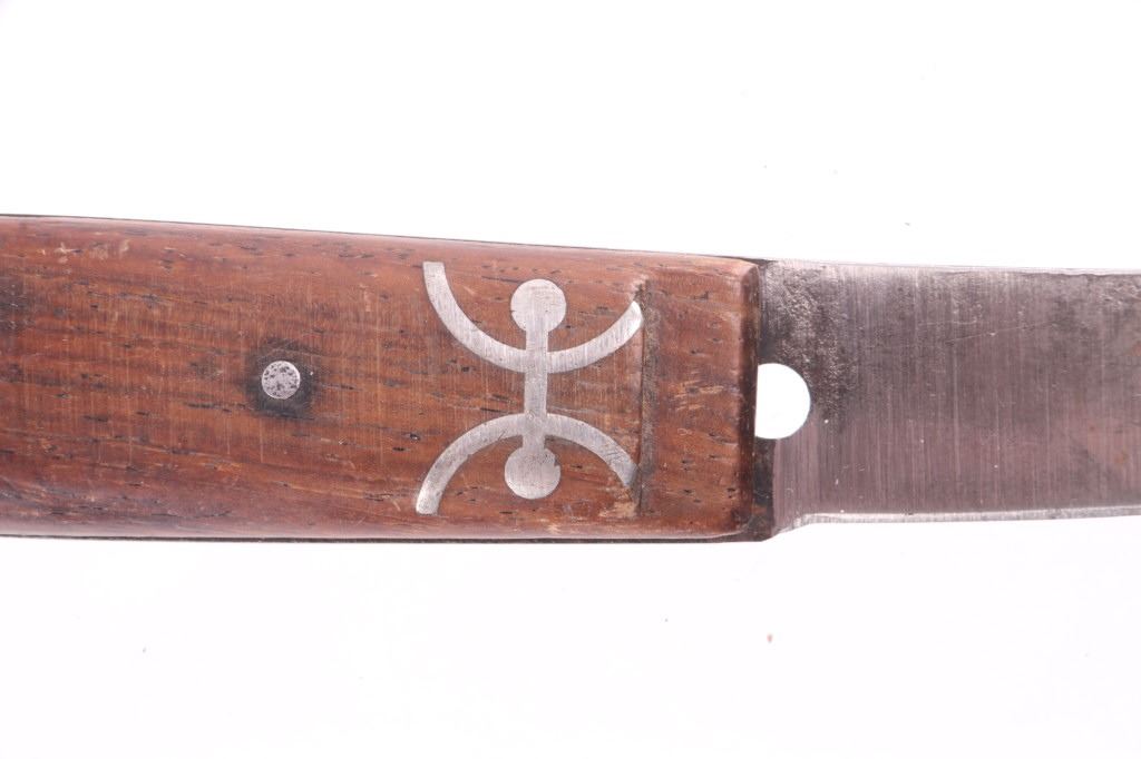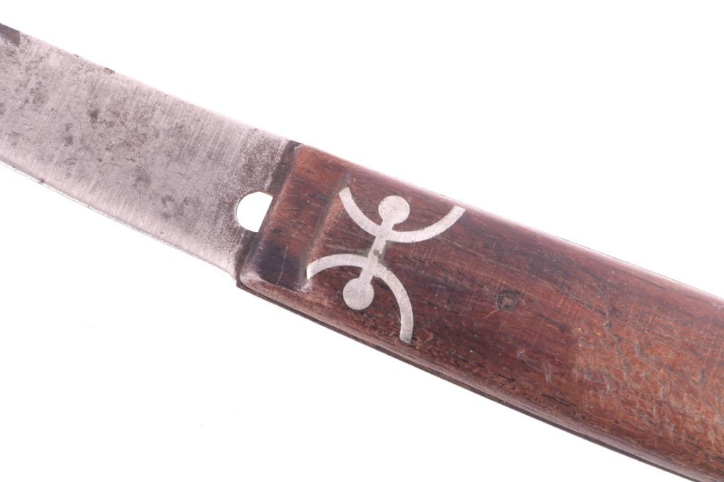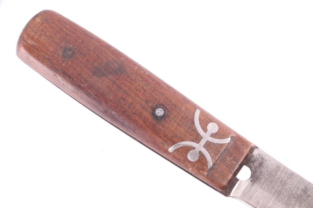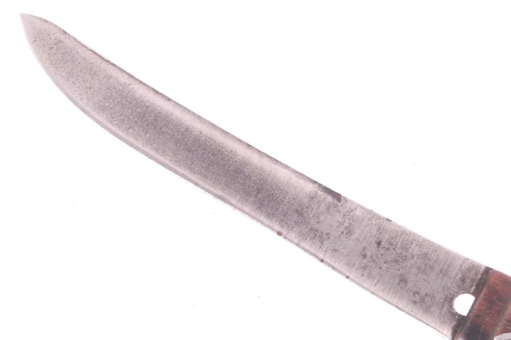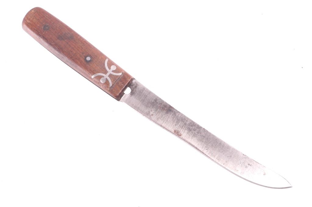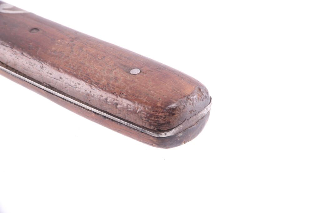This is an exceptionally artful Crow Native American Indian beaded sheath and trade knife dating to the fourth quarter of the 19th Century. The sheath is constructed of thick, dark brown harness saddle trade leather remnants with beautifully beaded traditional geometric Crow designs all in old glass trade seed beads of colors of chalk white, Cheyenne pink, blue, and red. The geometric pattern has a zig zag pattern with open triangular sections and old brass trade tacks, totaling four. The front also shows Indian tanned hide ties/ fringe, along with a red trade cloth ribbon. The back of the sheath shows the same Indian tanned hide belt tie. The trade knife shows a typical skinning-like blade with hardwood, likely walnut, and a nice attractive pewter inlay. Overall, the knife measures 10 ½ inches long. Provenance: From the ex-collection of Dale Harrison of Ohio. The sheath measures overall 12 inches long by 4 inches wide.