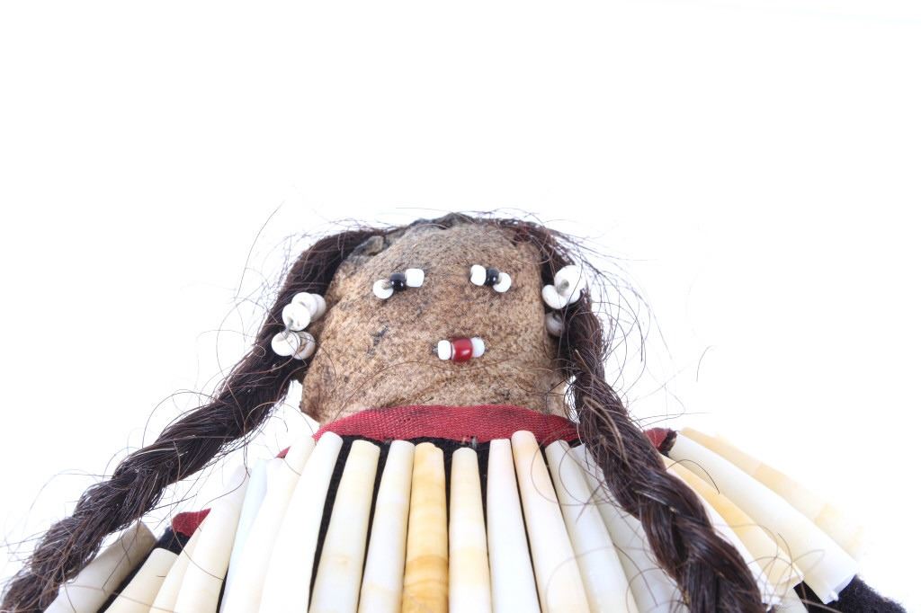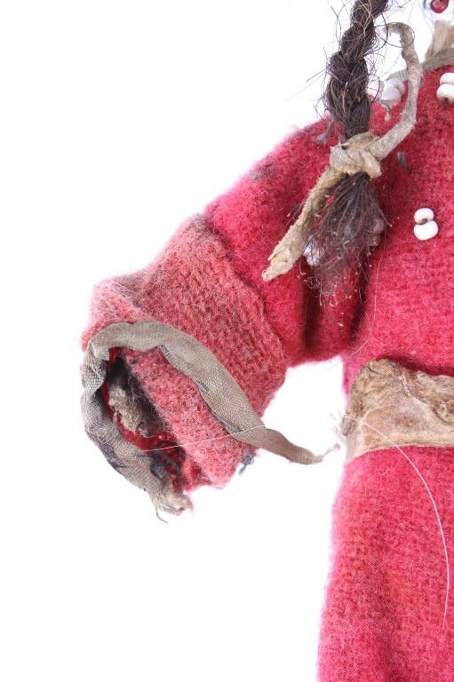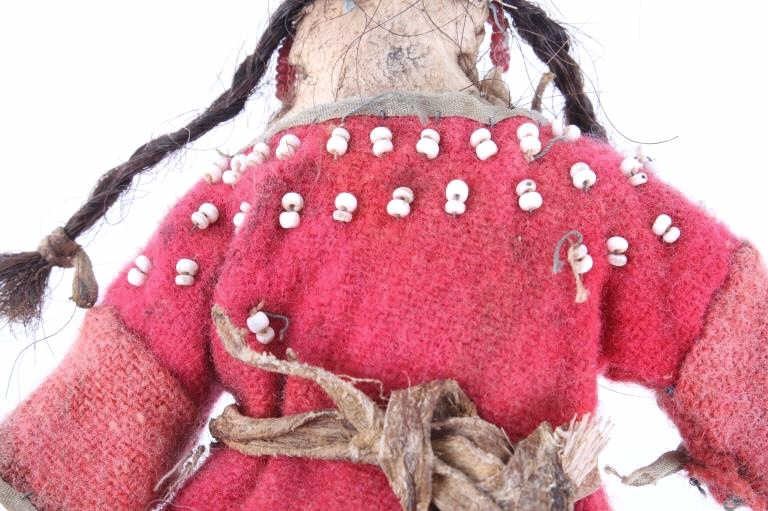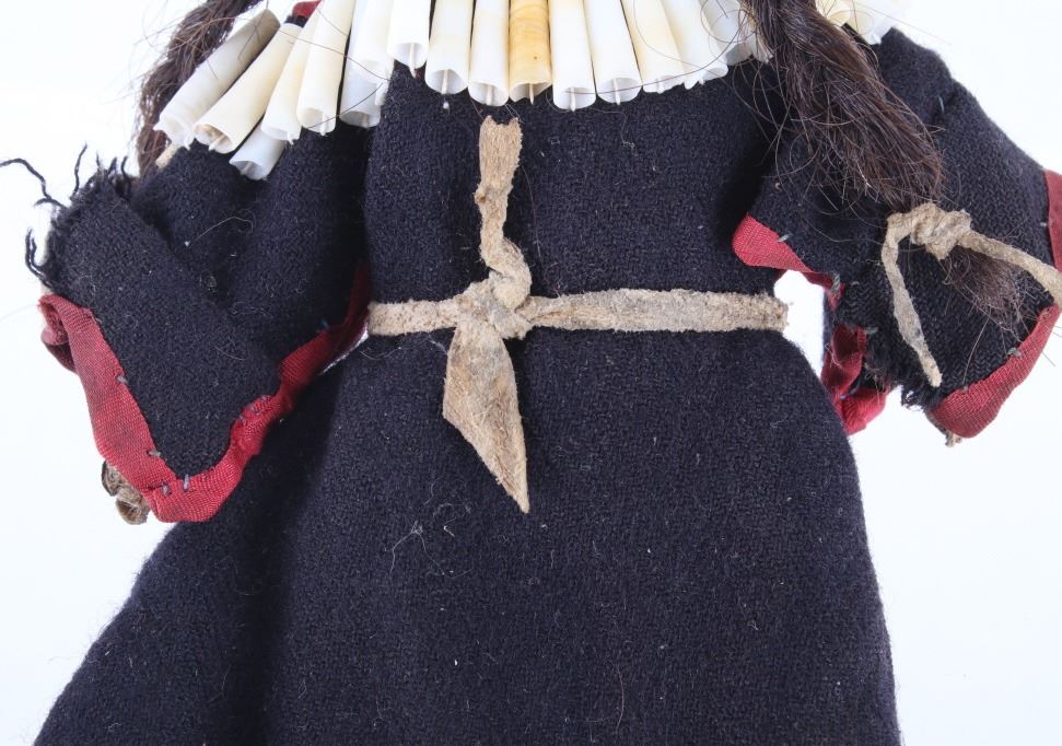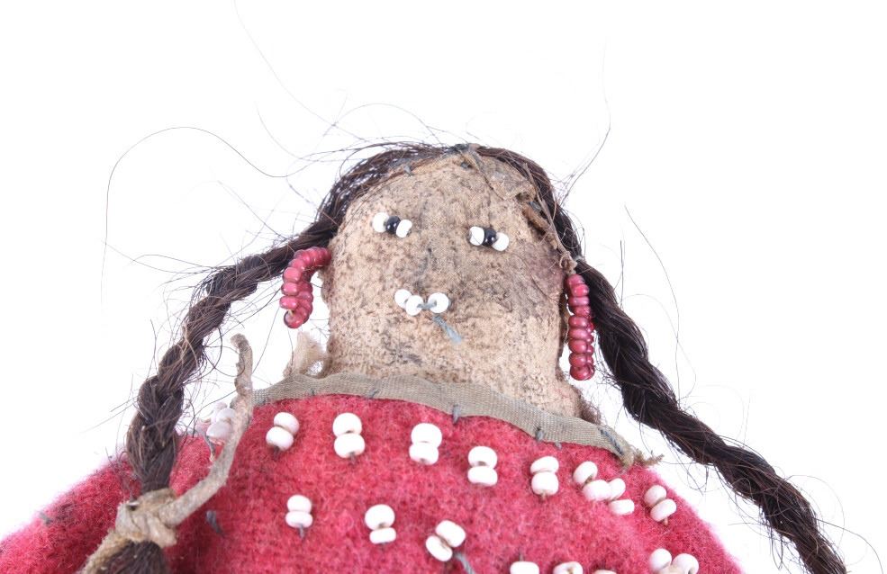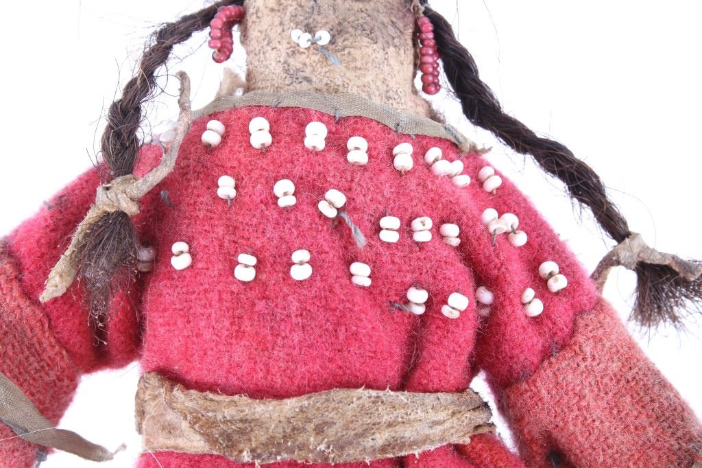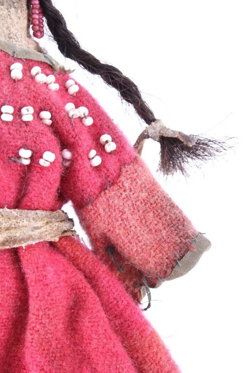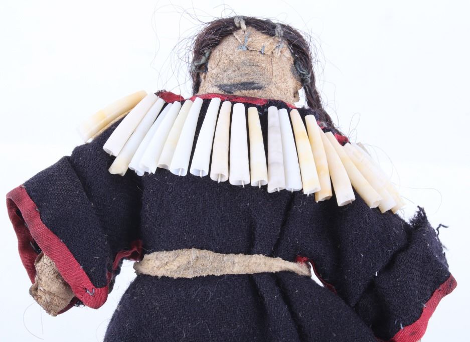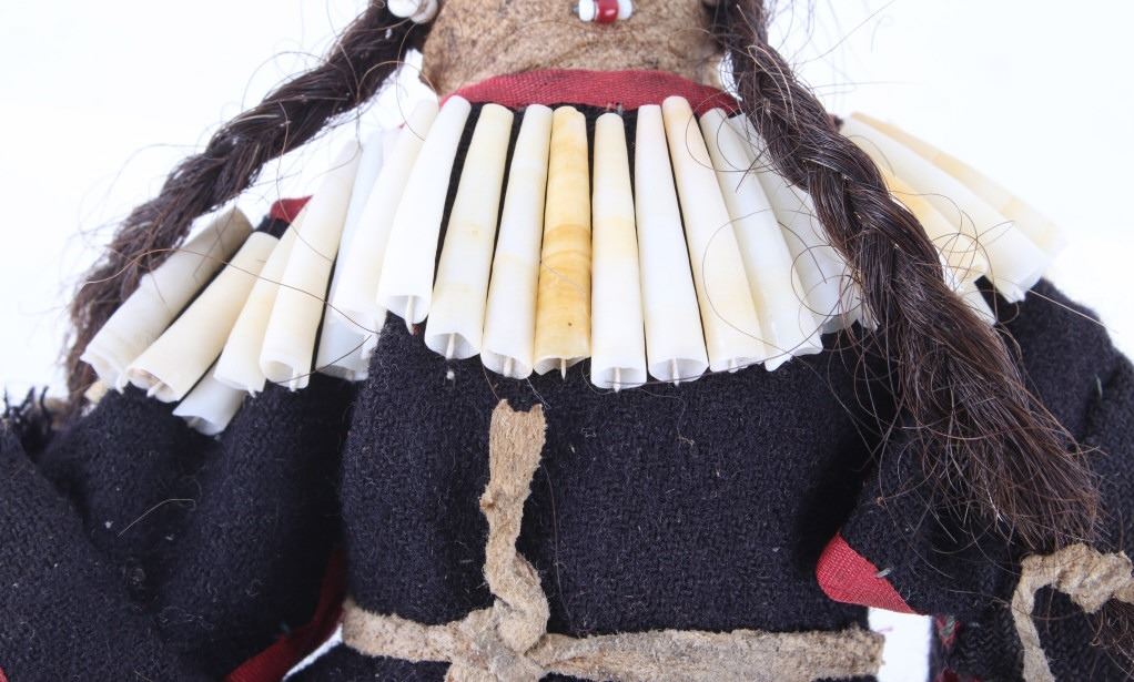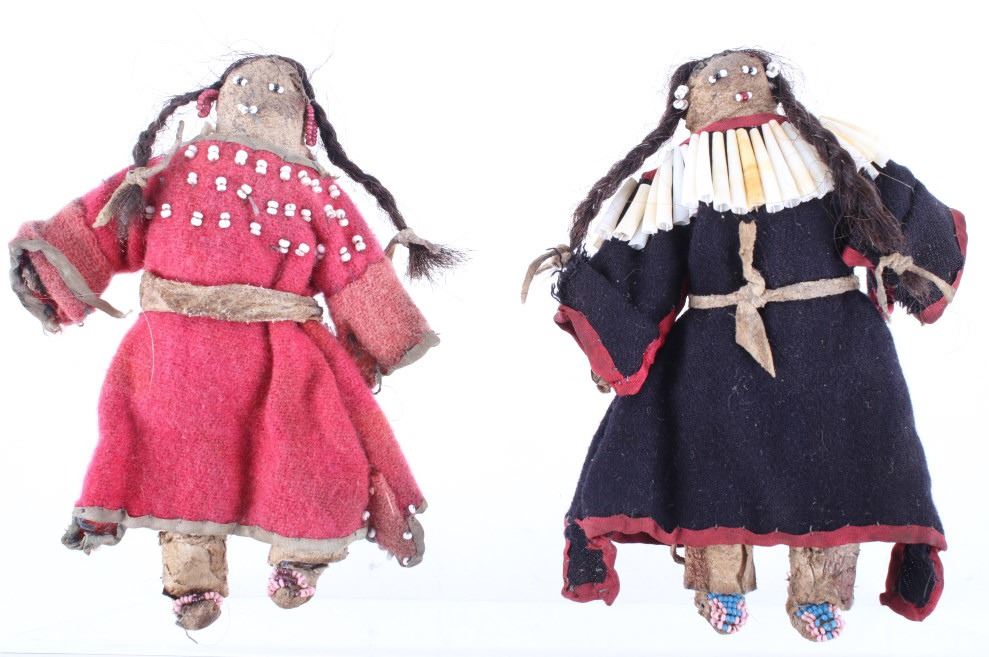 The lot features two hide and trade clothe child’s dolls from the 19th Century Crow Native American Indians. The first shows a dark blue trade stroud blanket dress with red ribbon edging on an Indian hide with period correct glass trade seed beads on the moccasins and facial features with real human hair and finished with a dentalium shell cape. The second doll also shows an Indian tanned hide construction with red stroud trade blanket dress having a ribbon edging and chalk white seed bead adornment on the dress made to represent Elk teeth along with period correct seed beads on the moccasins and facial features as well as real human hair. Both are sinew and trade thread sewn. Provenance: From a historic Eastern Montana American Indian Collection, where the piece was found to be an authentic original, one of the finest collections of American Indian weaponry and antiquities in Montana. Both are approximately 6”L by 4.25”W.
