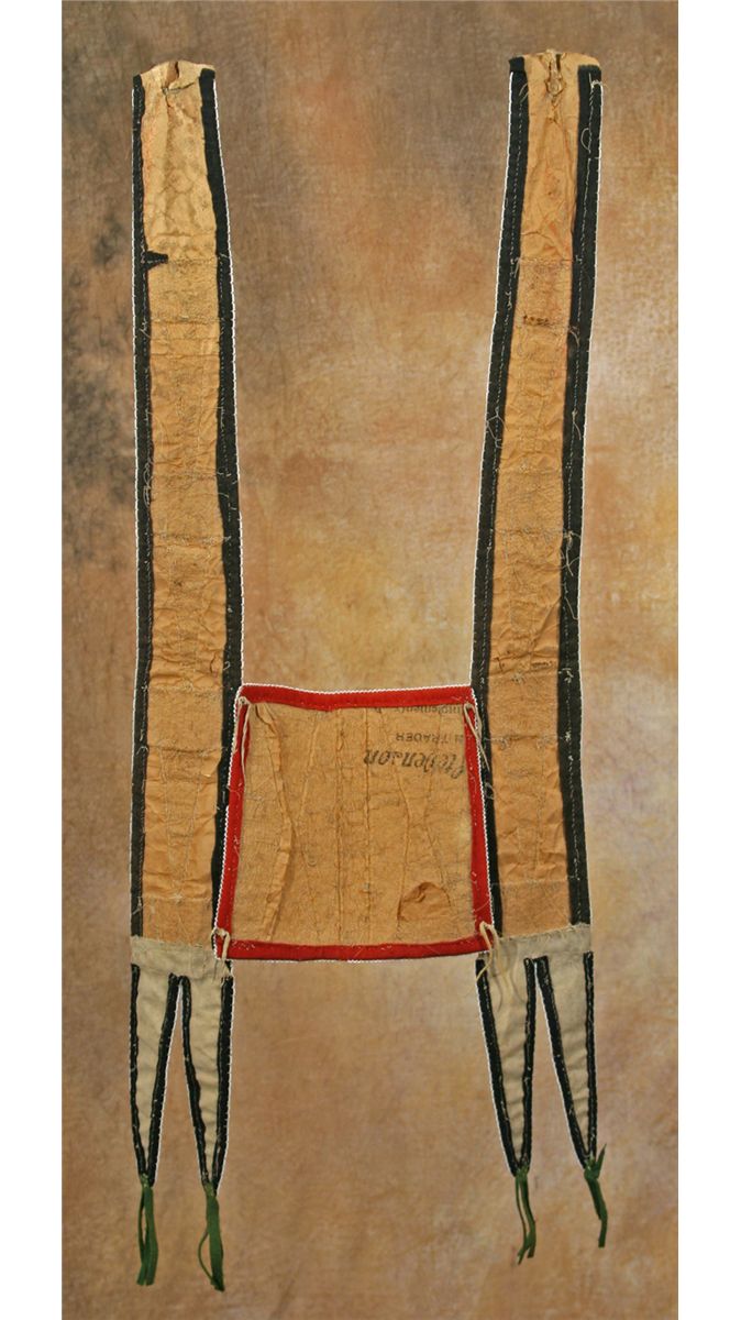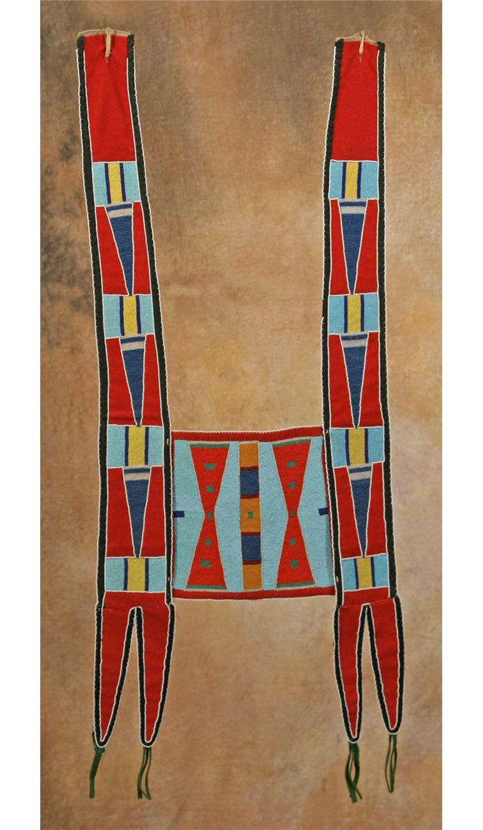Crow Martingale. 40" x 18". Beaded designs in an array of colors on trade cloth. Backed in canvas and covered in brown paper with partial printing: Stevenson...Trader...Implements Dry Green wool tassels. Circa 1900-1910.