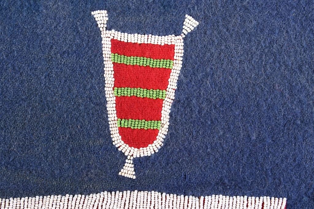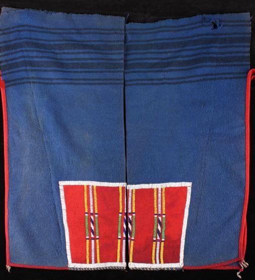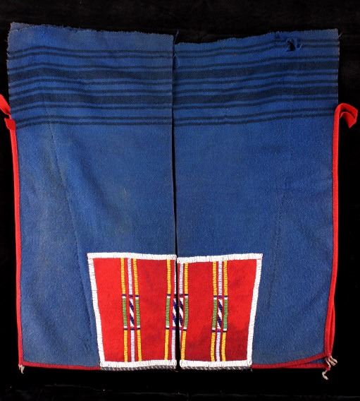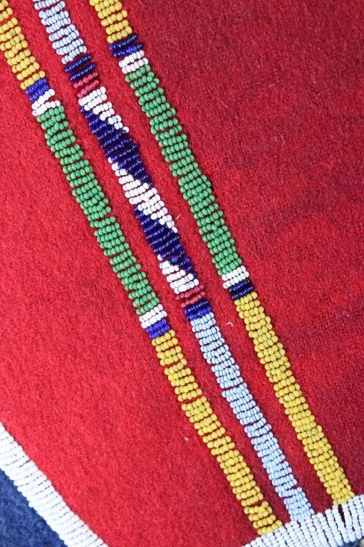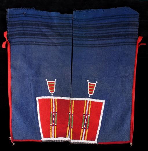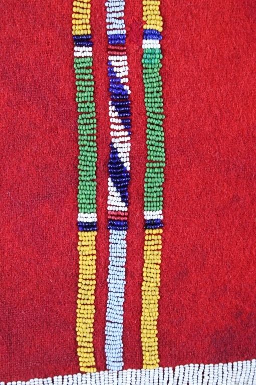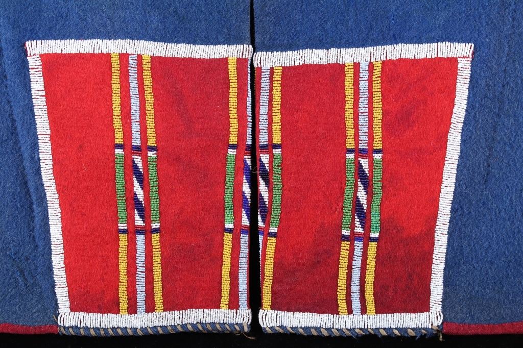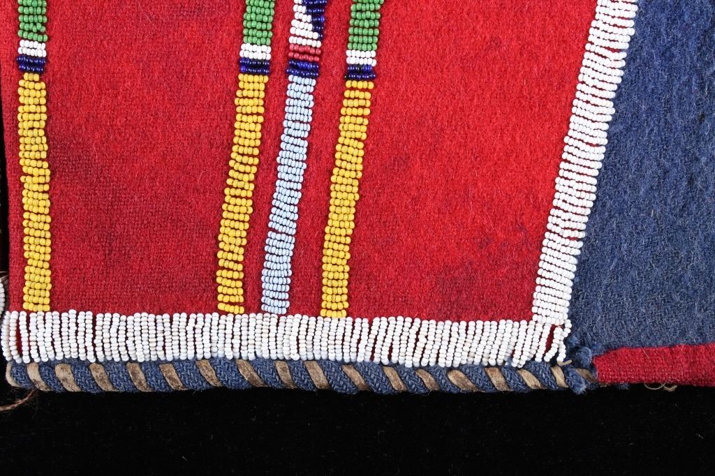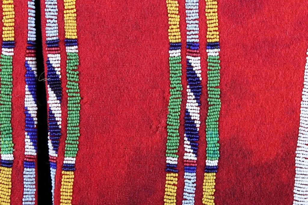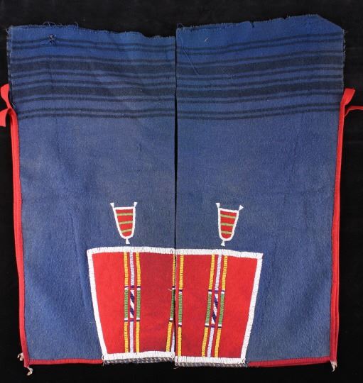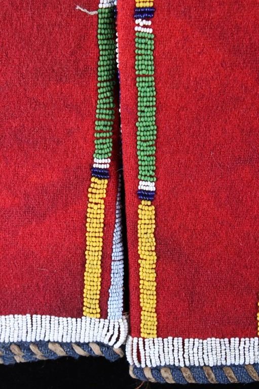 This is an outstanding set of 19th Century Crow Native American Indian wool leggings with wonderful beadwork. The leggings show an old all wool trade blanket construction with red shroud wool trade clothe edging and an artful section of red wool trade clothe which is accented by the geometric traditional beadwork. The beadwork and beads are all period correct 19th Century showing chalk white, greasy yellow, medium green, cobalt, sky padre blue and red white heart. The beadwork extends to both sides of each legging with an artful bell upside down bell or Buffalo symbol on the front. The set shows very good well-preserved museum quality condition with little to no bead loss. Provenance: From a large Marion, Massachusetts old American Indian collection. Each legging measures 32”L x 17”W individually.