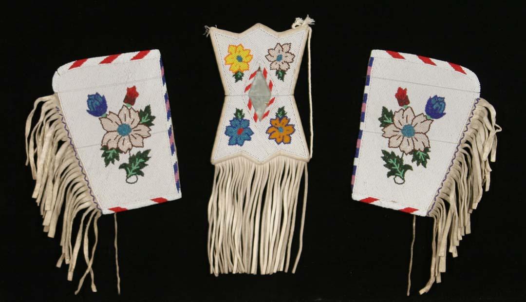 Crow Beaded Mirror Case & Cuffs. 8" x 5" Mirror Case (excluding tassels). 9" x 6 ½" Cuffs (excluding tassels). Cased in a shadowbox frame. Circa 1930s. (est $600-900). For condition reports please visit: www.auctioninsantafe.com/cr2011.pdf