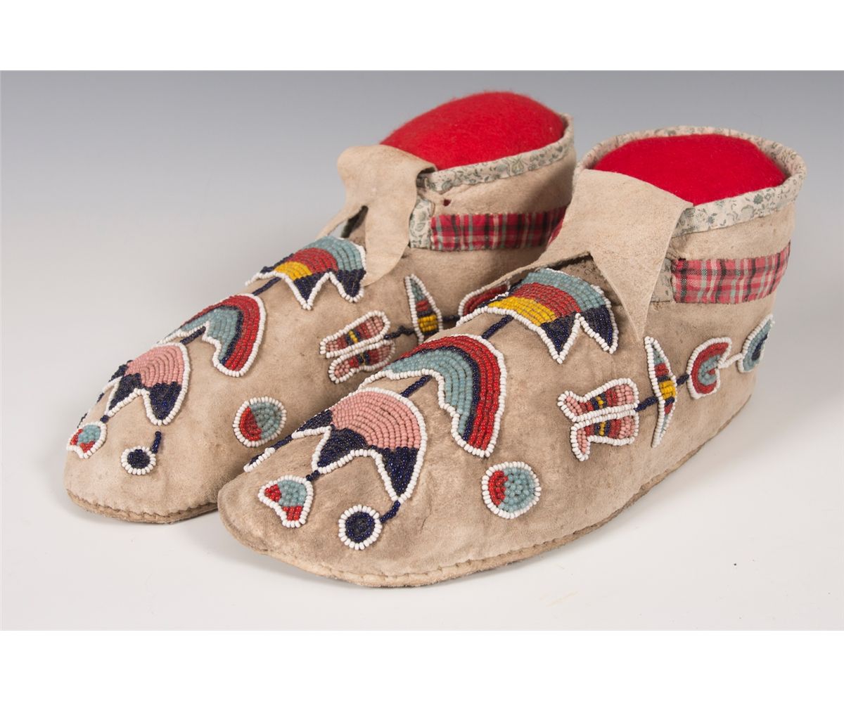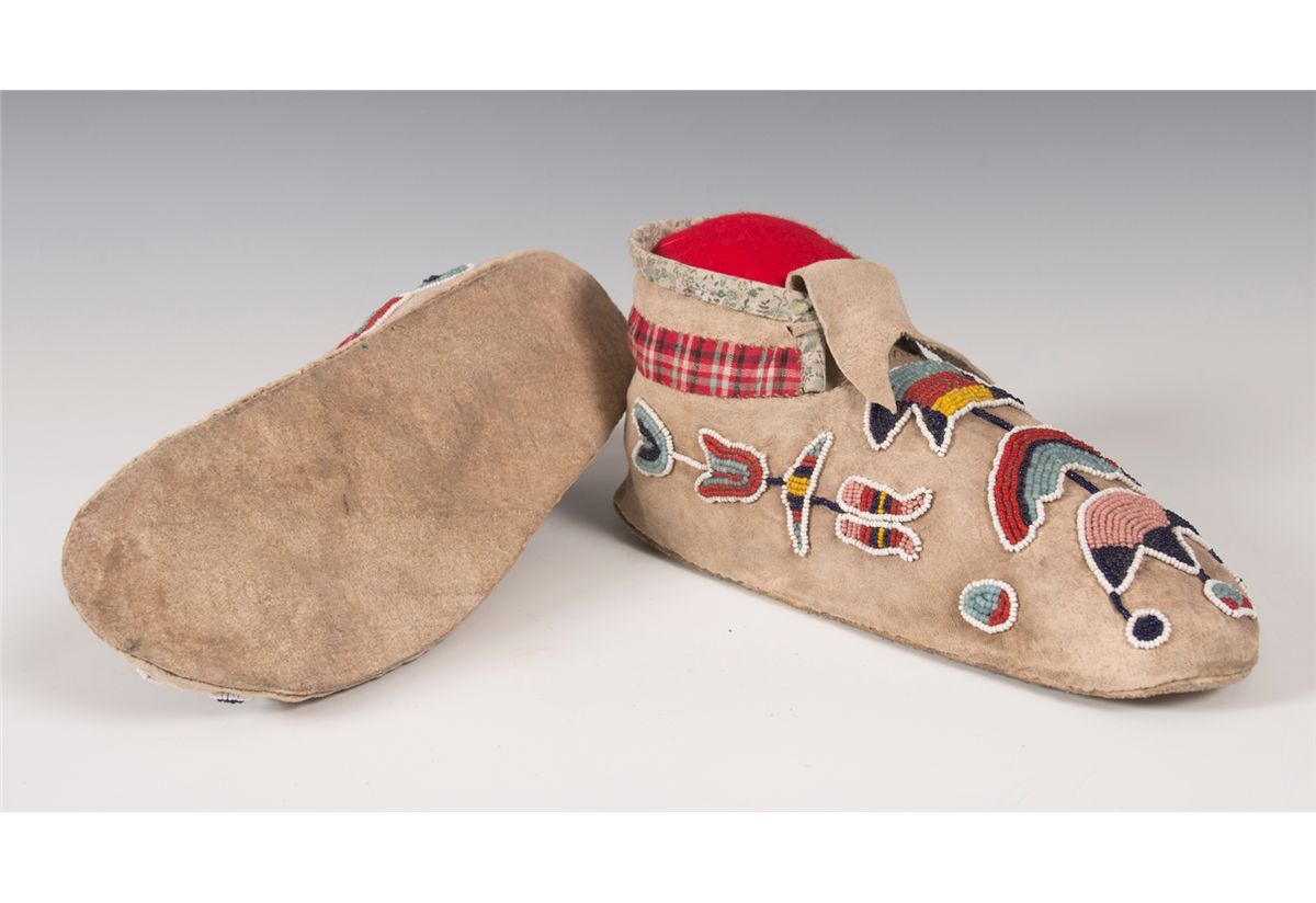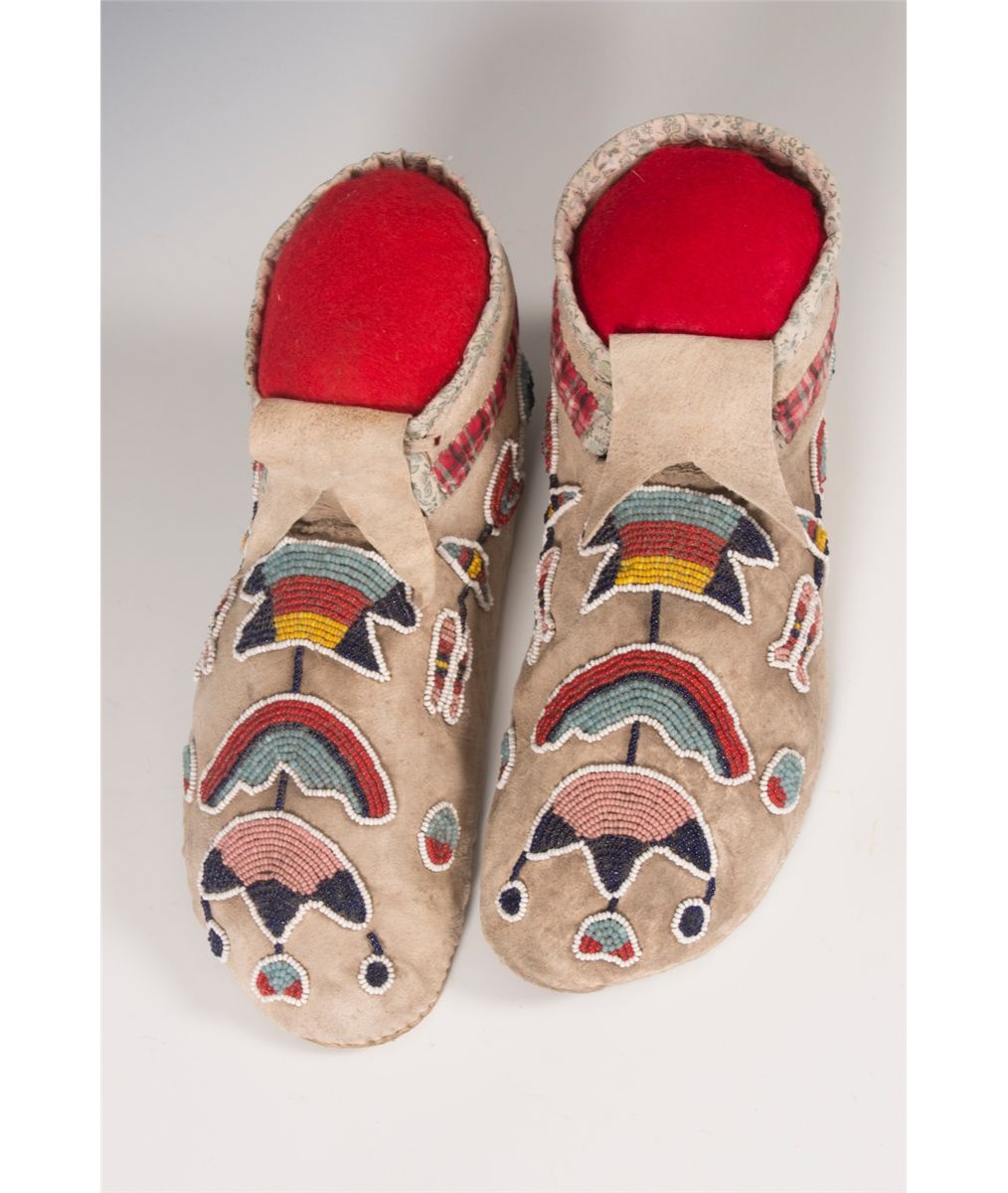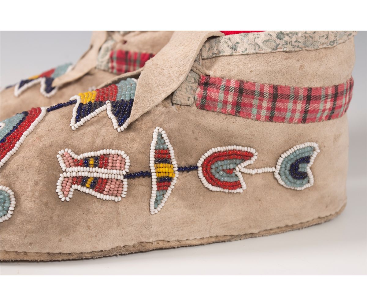 Crow Man's Moccasins. 10" with curvilinear beaded designs in a multitude of colors. Cuffs are edged in floral trade cloth, flanked by a band of plaid cloth. Circa 1880s. Provenance: Ex Lammer's Trading Post collection, Hardin, MT.