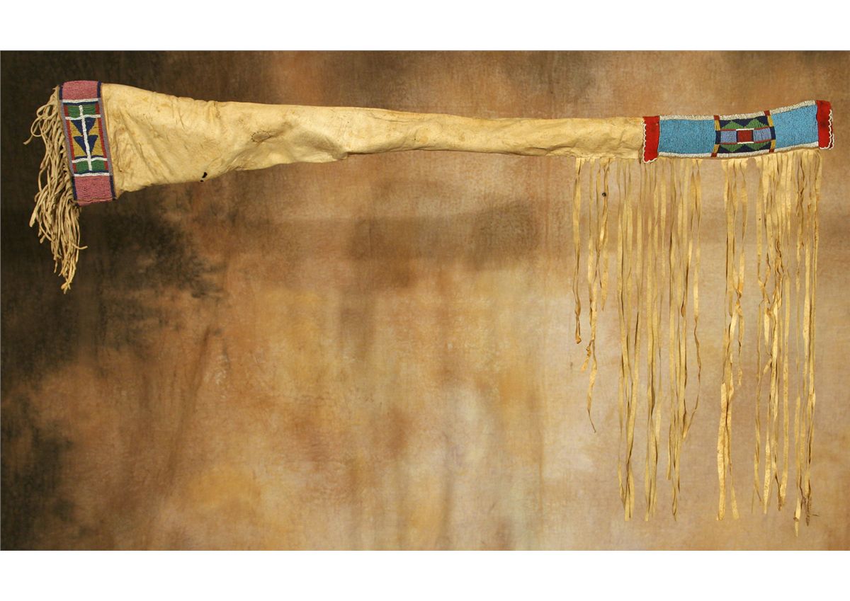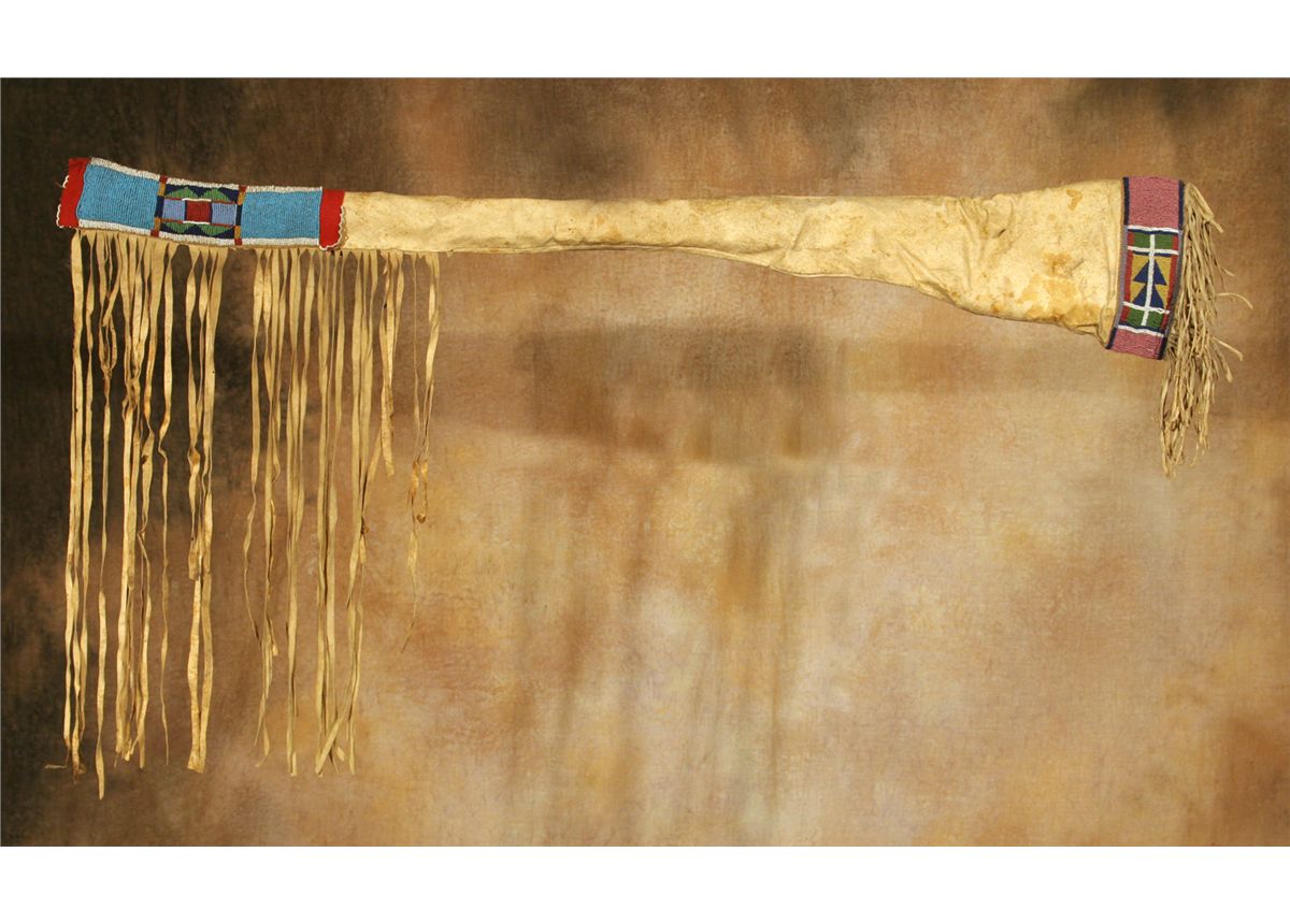 Crow Rifle Scabbard. 46" x 7.5". Classic beadwork on Indian tanned hide. Accented with 21" fringe on one end, 4" on the other. 19th century. Provenance: Collection of Dr. Delwin and Karen Bokelman, PA.