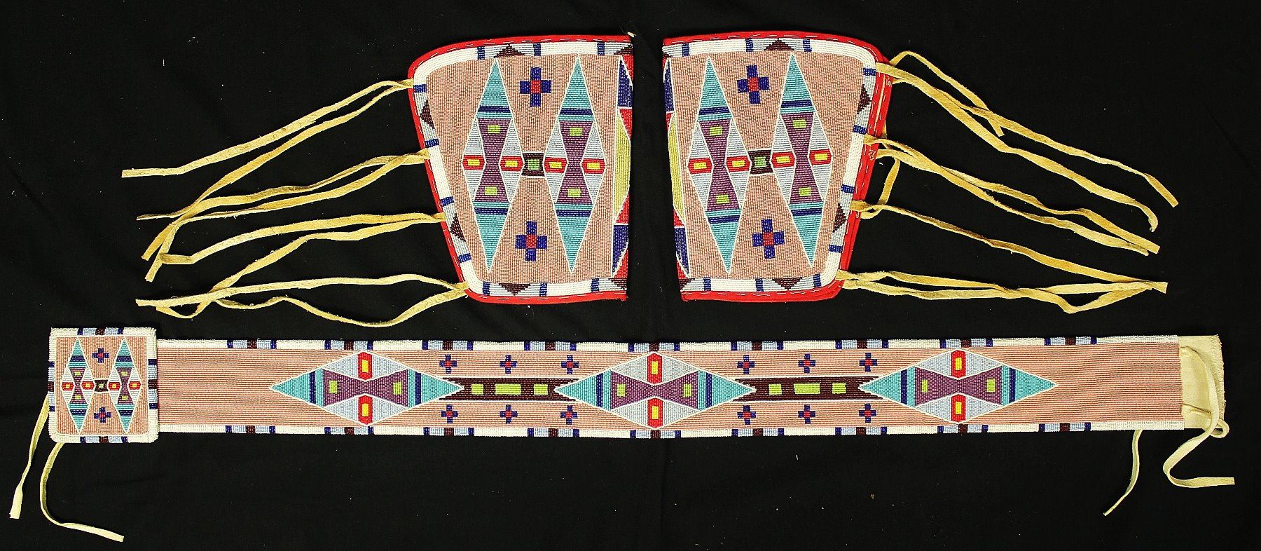 Alice Littlelight, Crow Agency MT made beaded set of massive Belt, Moccasins and Leggings, heavily flat beaded hour glass design with Crow pink background. In excellent condition.