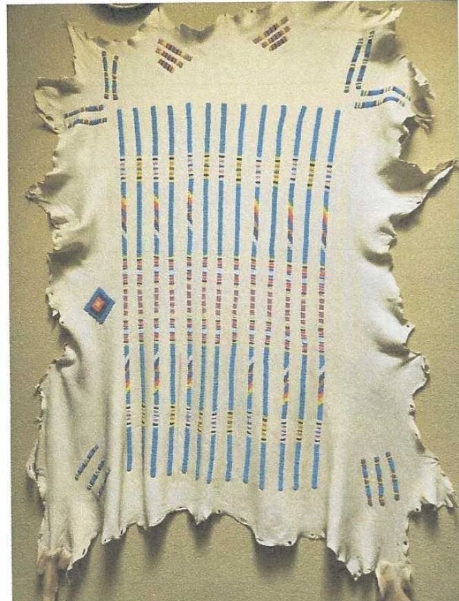 Native-tanned hide. Made in 1994 by Rebecca Falls Down. Red ribbon award from Gallup Intertribal Indian Ceremonial - 1994. 30"x60" with partial leg hair at bottom. Split stitching meaning the stitching was done by passing the needle through the inside of the hide, not the exterior. Backside is plain. Used in a wedding ceremony in 1994. In twenty years of trading in the northern plains, this was the only such robe I was ever able to obtain. Appraised $2,500 in 2005.
