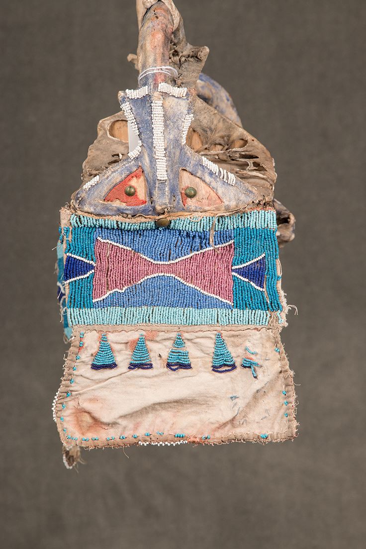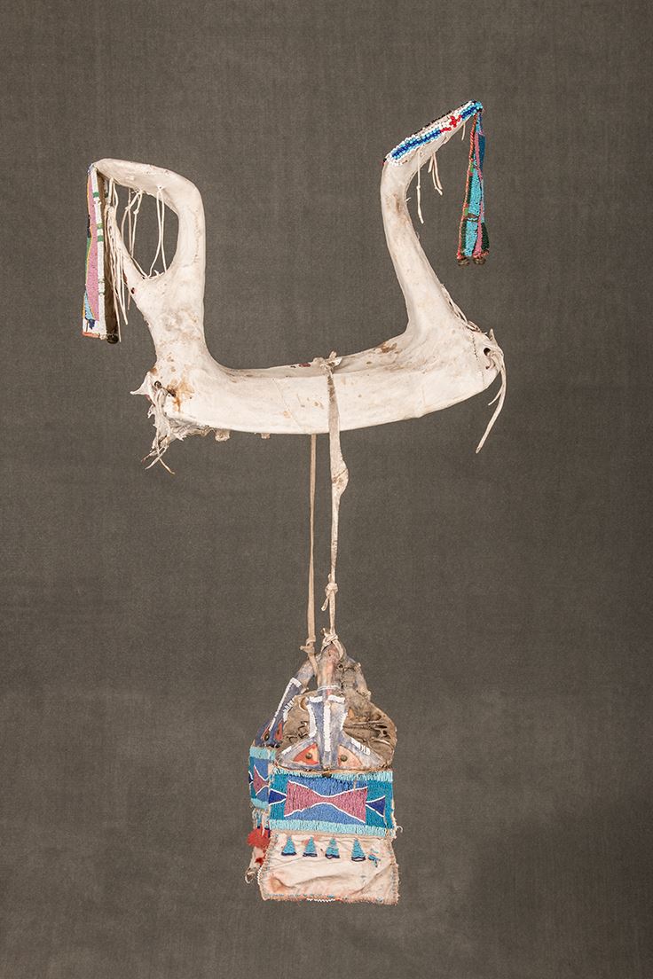 Crow Beaded Woman's Saddle and Stirrups. 18" x 15" x 9" saddle. White leather stretched over a rawhide covered tree. Large trade beads and an 8" drop with two hawk bells decorate the front pommel. Rear is decorated with brass tacks and another 8 ½" beaded drop with hawk bells. Together with beaded and tacked stirrups showing remnants of red trade cloth and blue paint. Late 19th century.