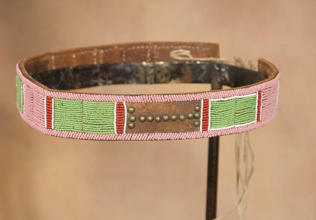 Crow Beaded & Tacked Belt. 31" x 2". Leather ties, nice bright colors. Early 20th century. (est $700-900). For condition reports please visit: www.auctioninsantafe.com/cr2011.pdf