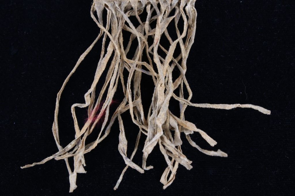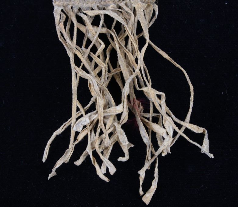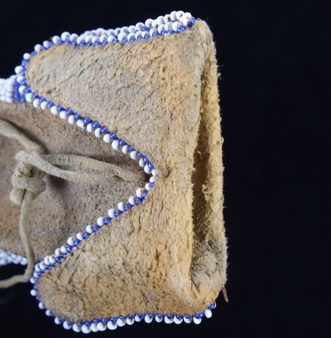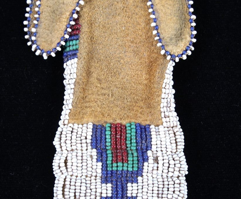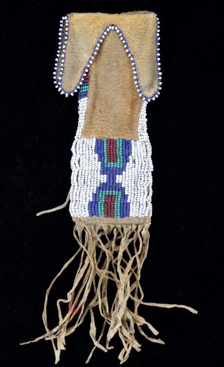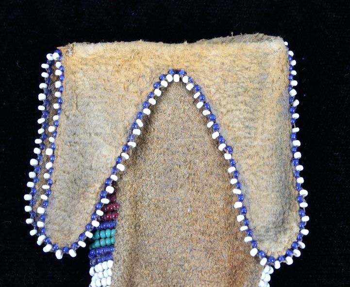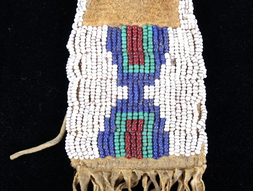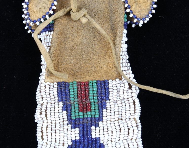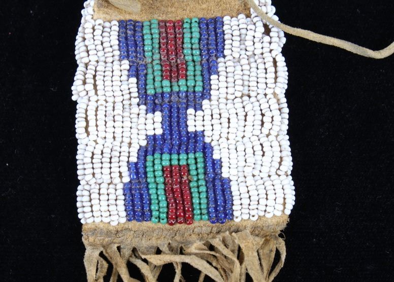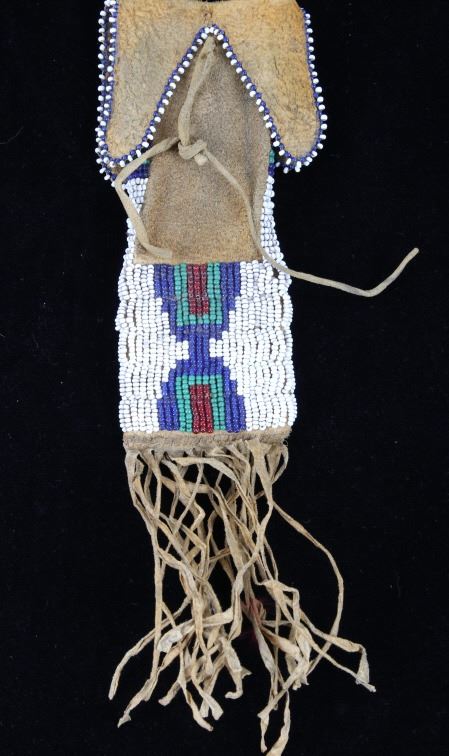 The lot features a fantastic piece done for the daughter of Crow Chief John Grey Bull from circa 1915-1930. This miniature beaded piece was made for and is from Dolly Grey Bull and shows a beaded pipe bag. The piece shows an Indian tanned hide construction with period correct early 1900’s glass trade seed cen beads done on both sides in a geometric pattern in colors of chalk white, cobalt, medium green and dark red. The bag has a wonderful bifurcated split four piece top flap with fancy beaded edge, beadwork strips down the outer edge of the neck of the bag which slightly curves in and finishes with the square fully beaded section with long frilly fringe at the base. The piece has a nice ocher mineral pigment coloring and the fringe has an artful frilly thin finish. The beadwork appears to all be sinew sewn attributing to the pieces circa 1915-1930 age. The top strap is still present, and the piece is in very good well preserved condition. Provenance: From a historic Eastern Montana American Indian Collection, where the piece was found to be an authentic original, one of the finest collections of American Indian weaponry and antiquities in Montana. Measures 11”L by 2.75”W.