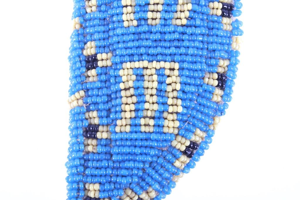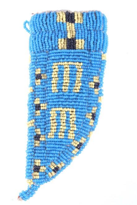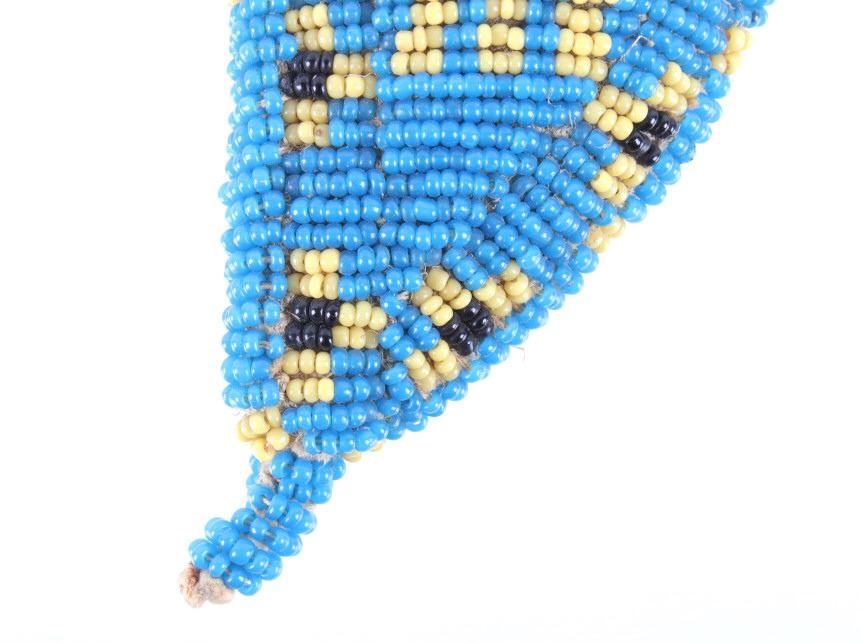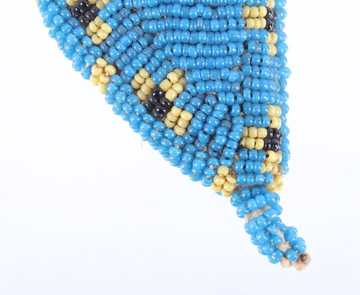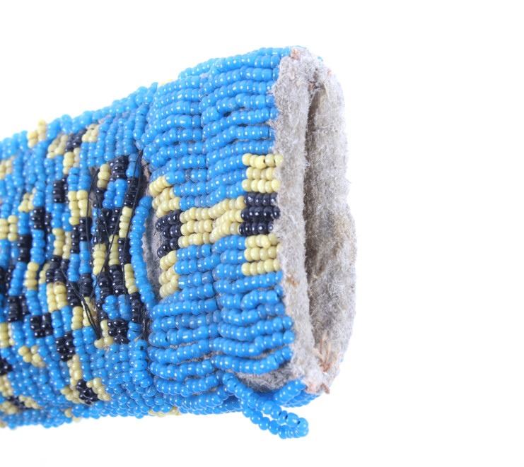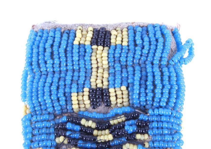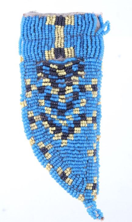 The lot features a fantastic piece done for the daughter of Crow Chief John Grey Bull from circa 1915-1930. This miniature beaded piece was made for and is from Dolly Grey Bull and shows a fully beaded knife sheath. The piece shows a heavy trade cloth or blanket construction with period correct early 1900’s glass trade seed cen beads done on both sides in a geometric pattern in colors of greasy yellow, black and greasy blue. The base of the sheath shows a small rope beaded single fringe and the bag appears to be sinew and trade thread sewn. The piece shows slight bead loss, but overall is well preserved in very good condition for its 1915-1930’s age. Provenance: From a historic Eastern Montana American Indian Collection, where the piece was found to be an authentic original, one of the finest collections of American Indian weaponry and antiquities in Montana. Measures 5”L by 2.25”W.