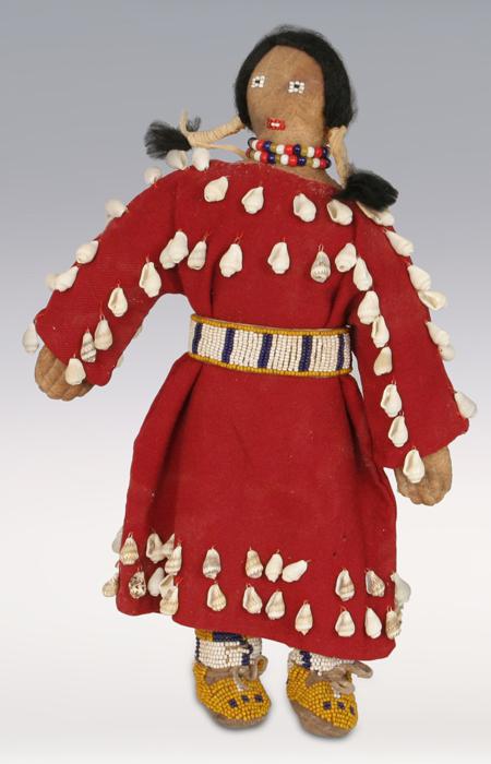 Crow Doll. Early red trade cloth with shell embellishments. 11” tall with double-strand pony bead necklace and fully beaded belt and high-top moccasins. 19th century. Condition Report: Excellent condition.
