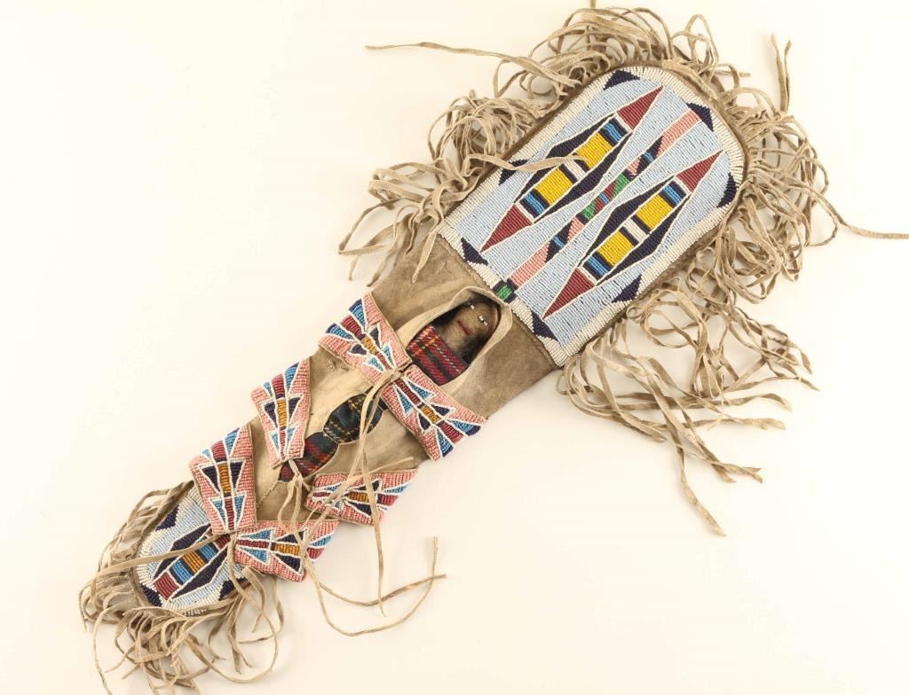 All leather construction with beautiful beaded geometric motif fringed leather with small handmade doll, measures 21" overall, circa 1900's.