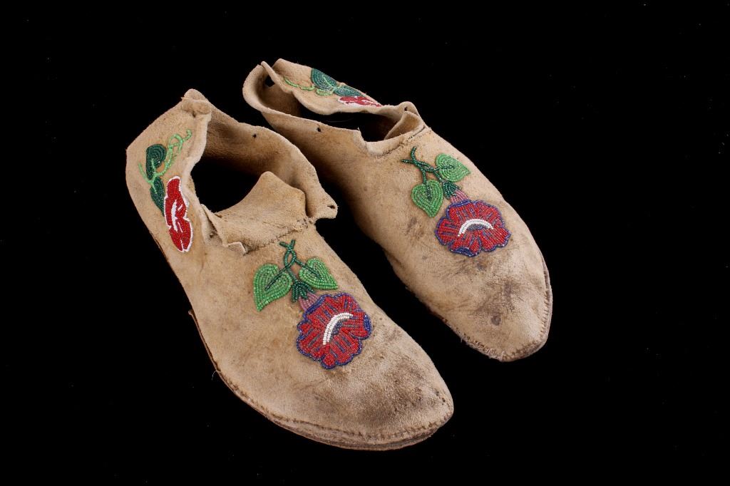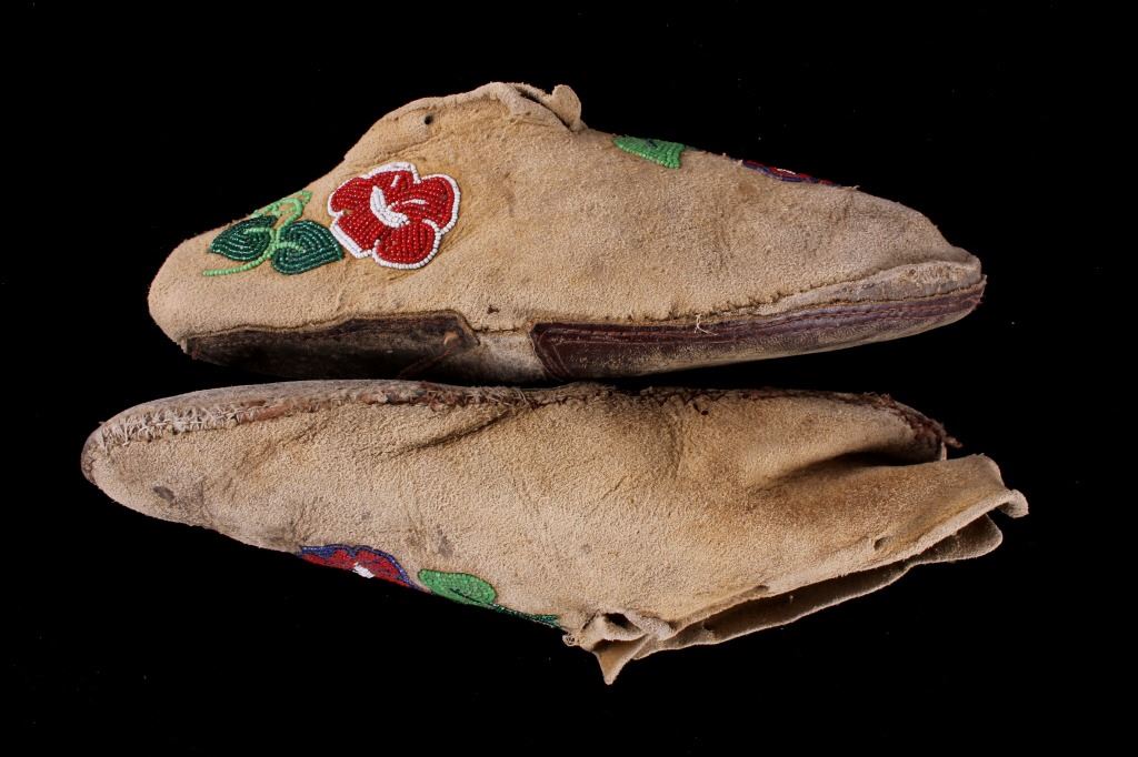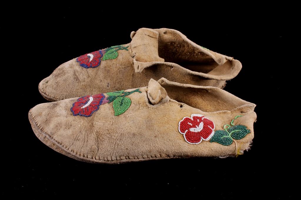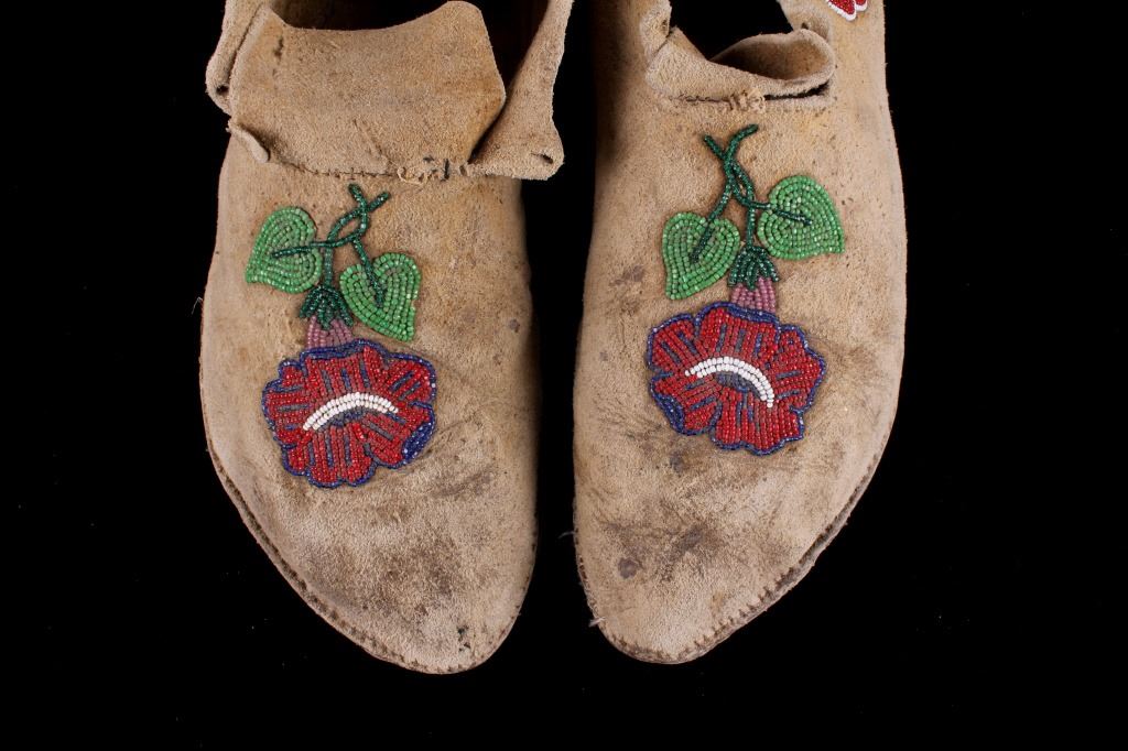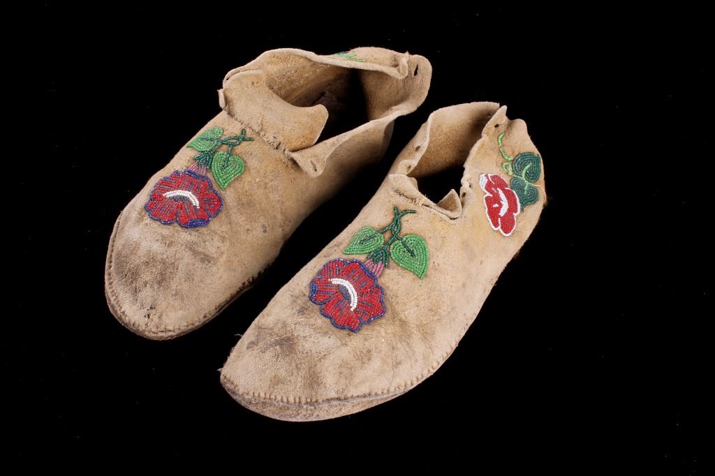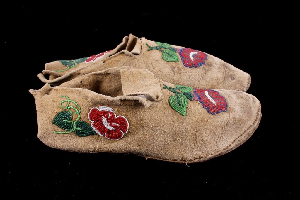 This is a fantastic set of hide, floral beaded moccasins from the Crow Native American Indians of Montana, dating to the 19th Century. This circa 1890-1900 set shows Indian tanned Buffalo Bison hide with hard soles and beadwork in all early period correct, glass trade petit seed beads, showing a fine floral rose pattern. The beadwork shows colors of chalk white, cobalt, medium green, greasy green, lilac, and red. The moccasins have a sinew sewn construction with old Indian repaired soles. One sole shows harness saddle leather sewn to the base. The other shows the original hard sole repaired with sewn, trade cotton thread. Both bases have a nice, worn foot patina. Provenance: From a historic Eastern Montana American Indian Collection, where the piece was found to be an authentic original, one of the finest collections of American Indian weaponry and antiquities in Montana. Each measures 10”L by 4.25”W by 3”H.
