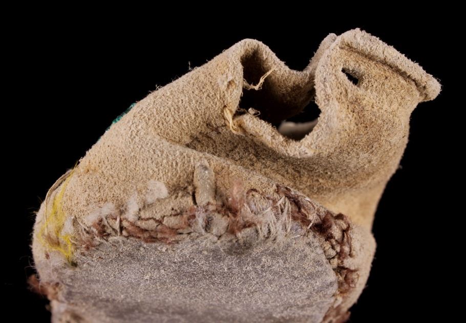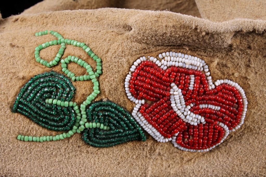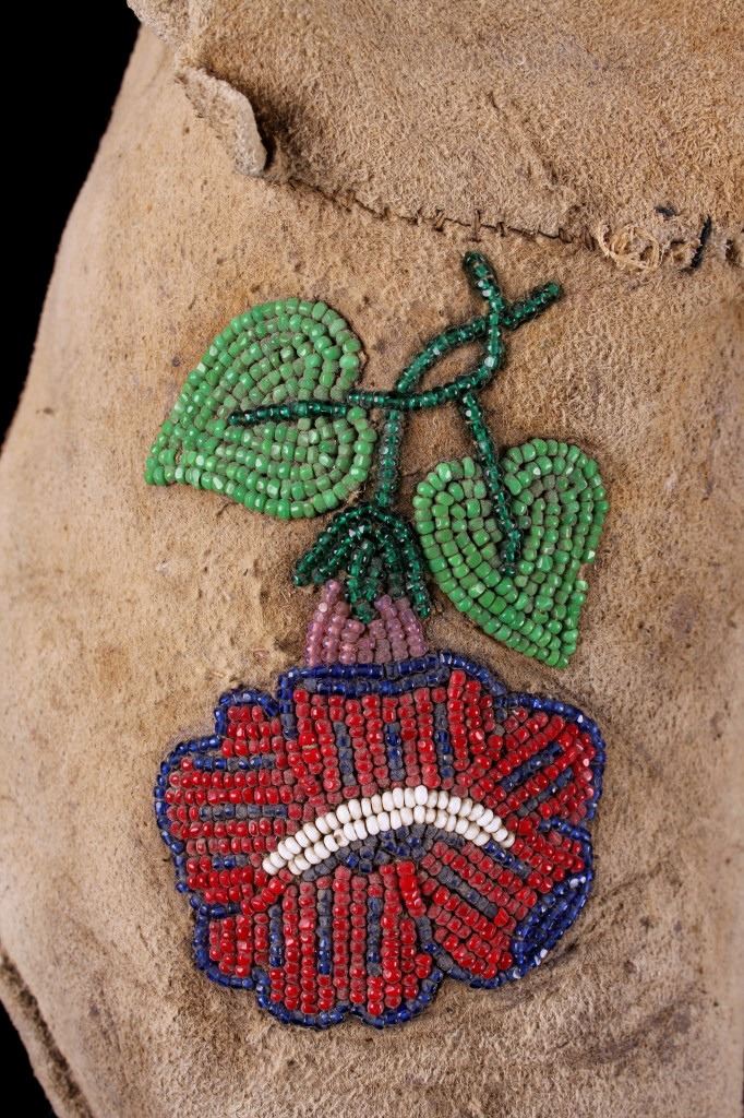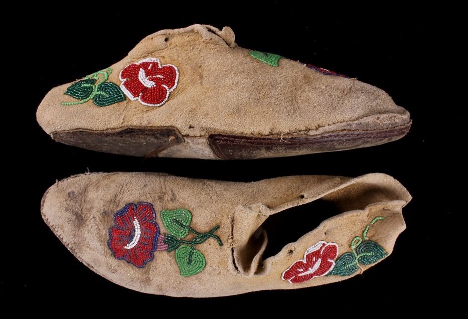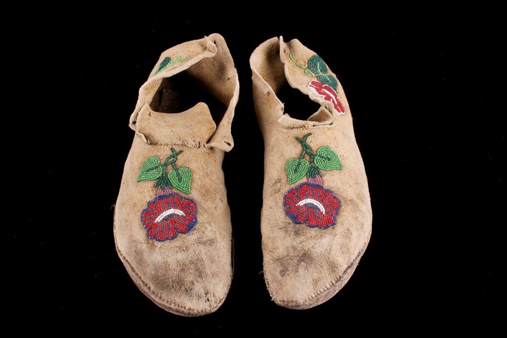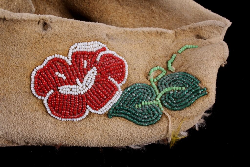 This is a fantastic set of hide, floral beaded moccasins from the Crow Native American Indians of Montana, dating to the 19th Century. This circa 1890-1900 set shows Indian tanned Buffalo Bison hide with hard soles and beadwork in all early period correct, glass trade petit seed beads, showing a fine floral rose pattern. The beadwork shows colors of chalk white, cobalt, medium green, greasy green, lilac, and red. The moccasins have a sinew sewn construction with old Indian repaired soles. One sole shows harness saddle leather sewn to the base. The other shows the original hard sole repaired with sewn, trade cotton thread. Both bases have a nice, worn foot patina. Provenance: From a historic Eastern Montana American Indian Collection, where the piece was found to be an authentic original, one of the finest collections of American Indian weaponry and antiquities in Montana. Each measures 10”L by 4.25”W by 3”H.