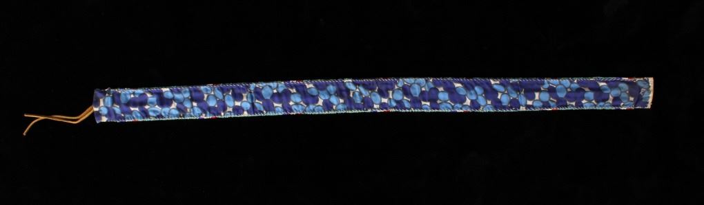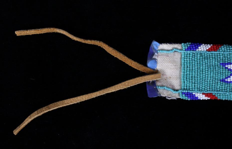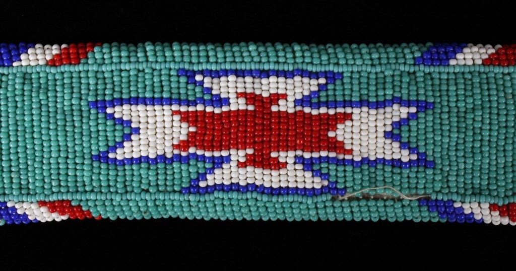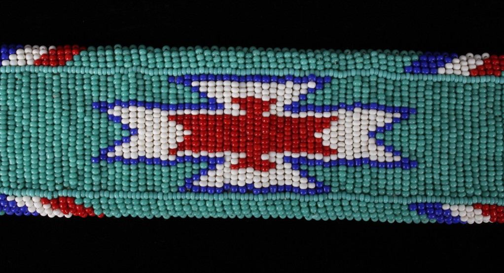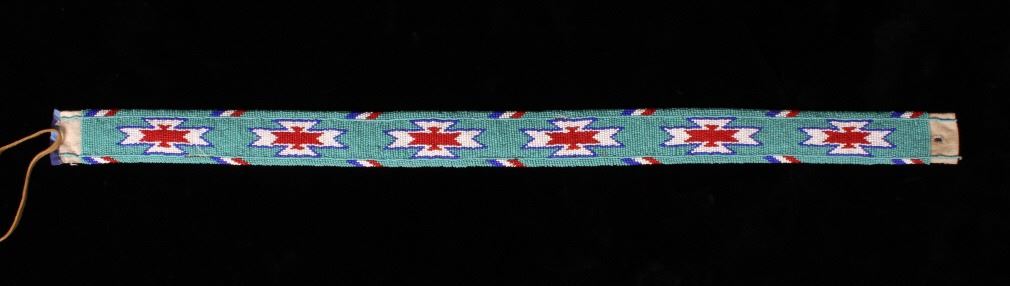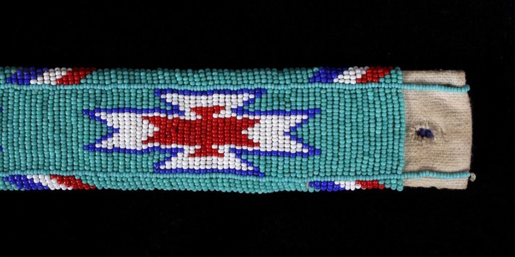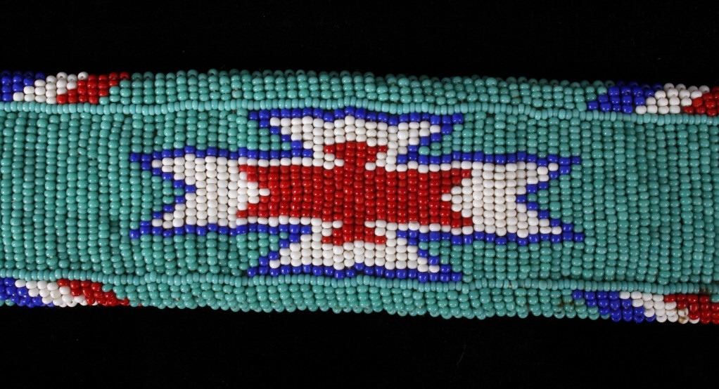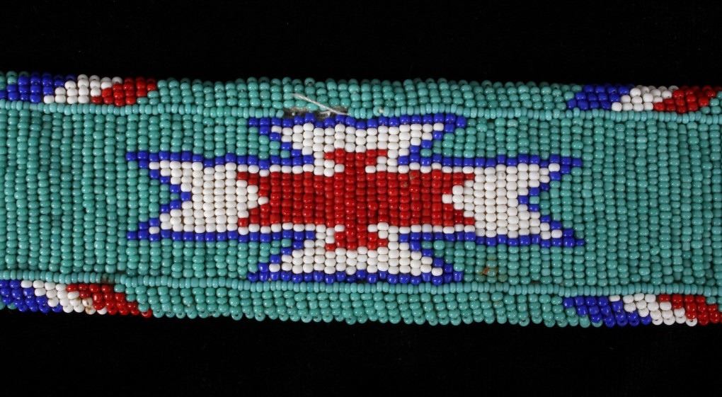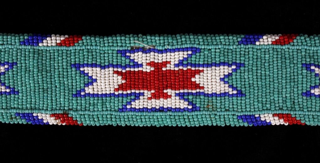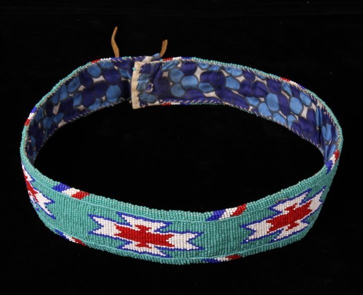 This is a fully beaded Crow Montana Native American Indian belt from the mid-1900's. This mid-20th Century piece shows a tent canvas construction with sillk like colorful lining and glass trade seed beaded finish in a geometric design of blye, chalk white, cobalt and red. The belt shows a hide tie. Measures overall 27"L x 1.75"W.