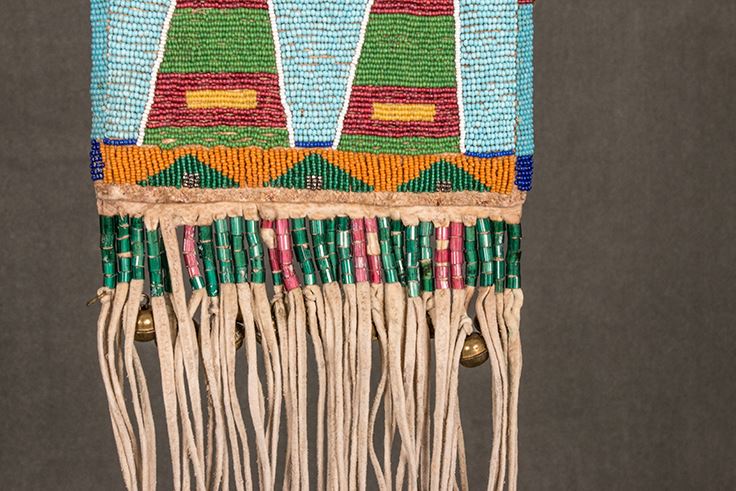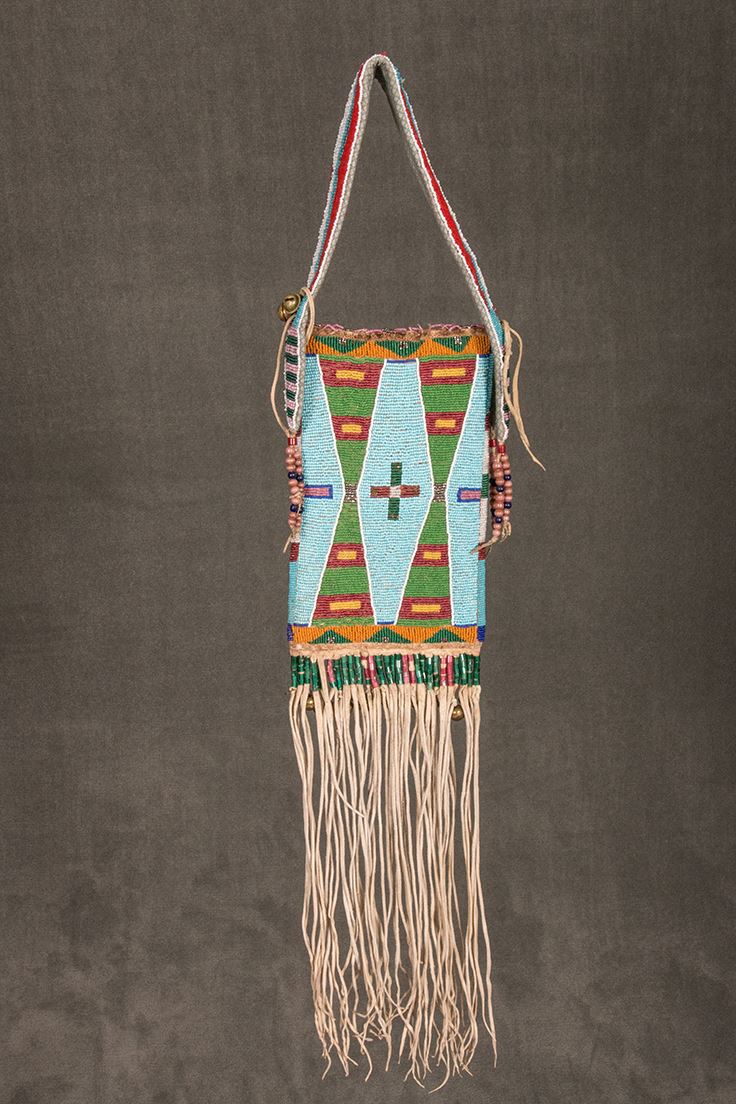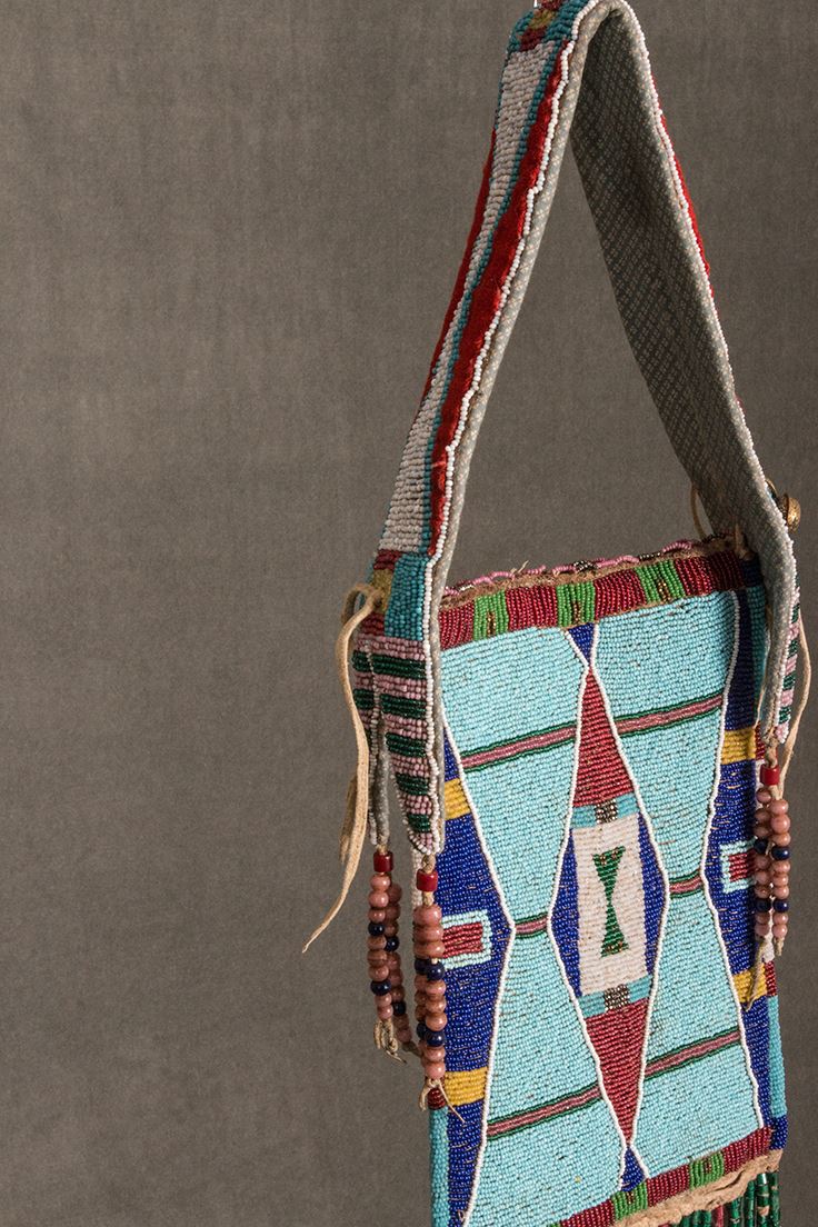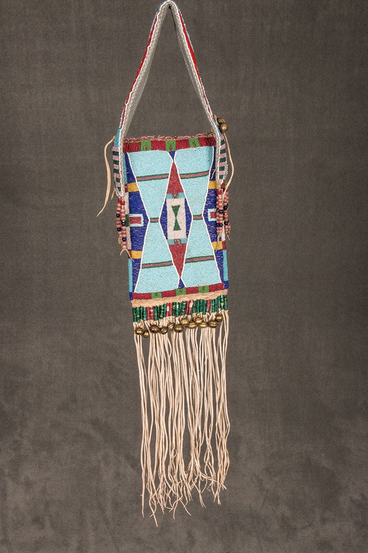 Crow Fully Beaded Mirror Bag. 27" long with fringe. Classic Crow geometric designs in blues, white-heart reds, white and faceted metal beads. Strap is beaded in blues, white, pinks and white-heart reds on a trade cloth background. Accented with hawk bells and trade beads. A museum quality artifact. Circa 1890.