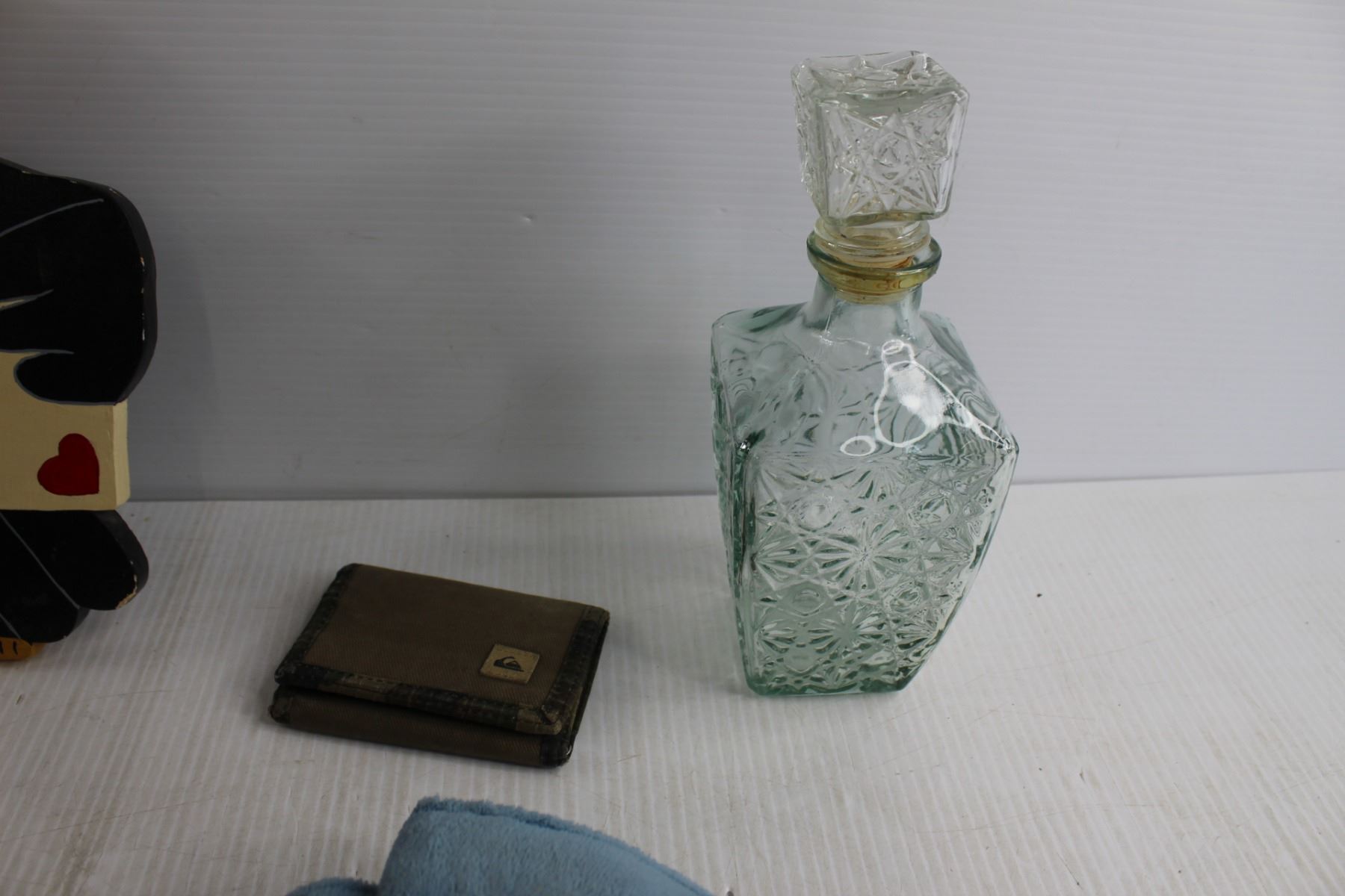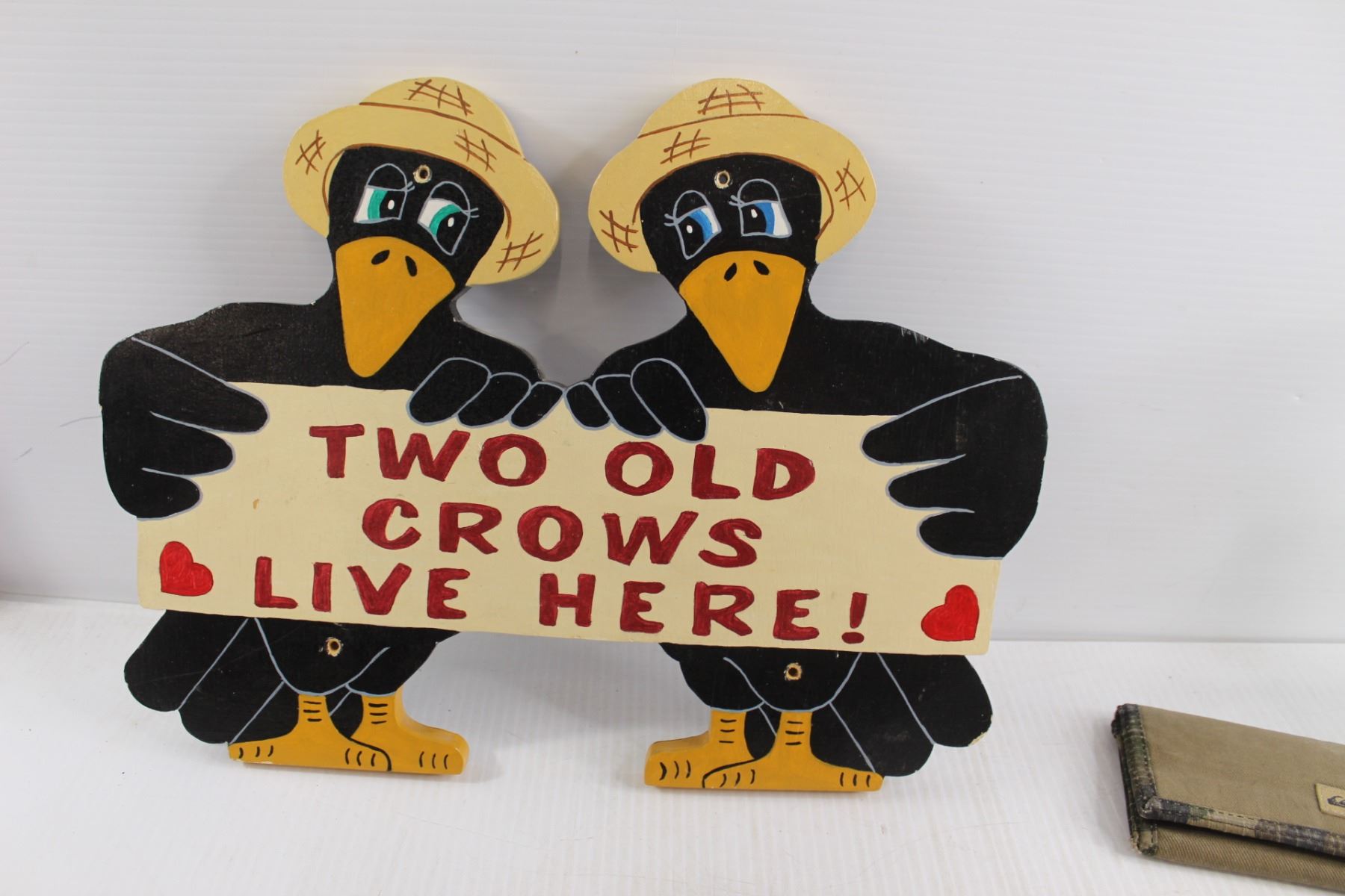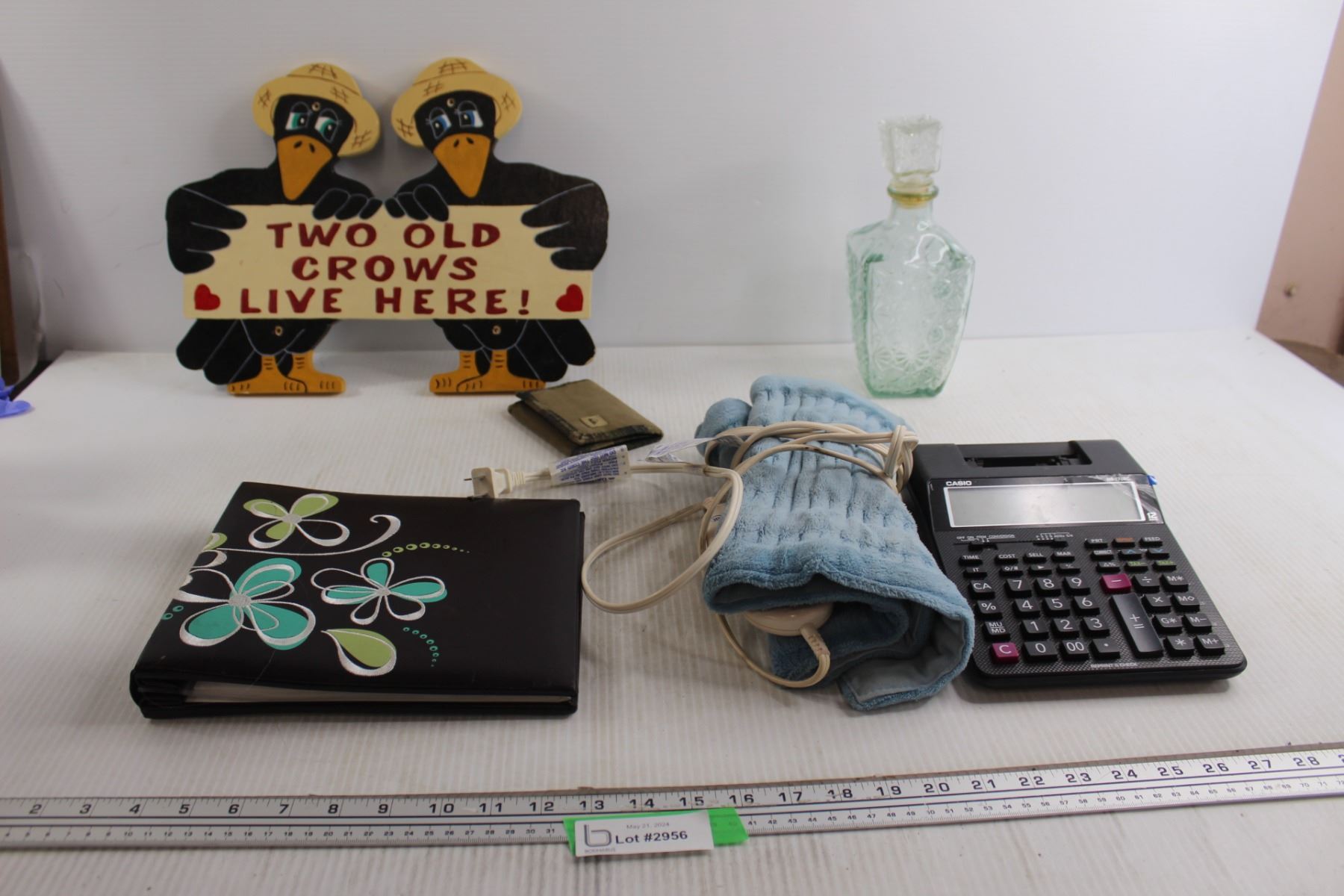 Crow Garden Sign, Glass Decanter, Heating Pad, Misc.