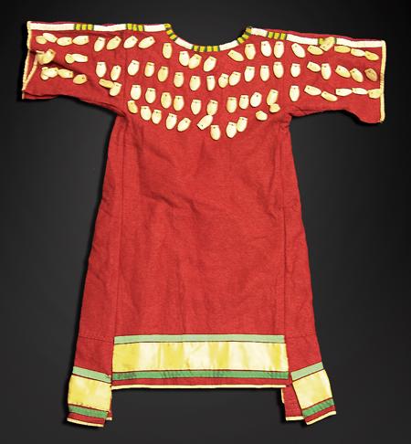 Circa Late 1900s, Classic design hand crafted red felt girls dress with ribbon trim and carved bone "elk teeth." Excellent condition. 30" long, 14" waist From the Johnson Collection.