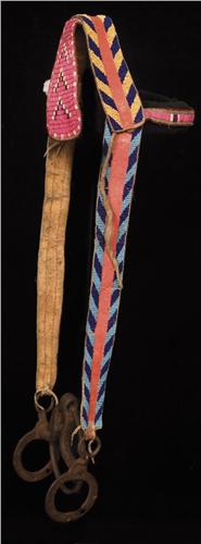 Crow Headstall. Beaded and dyed. Quilled drop and ring bit. 19th Century. Fine condition. (est $2,500-3,500).