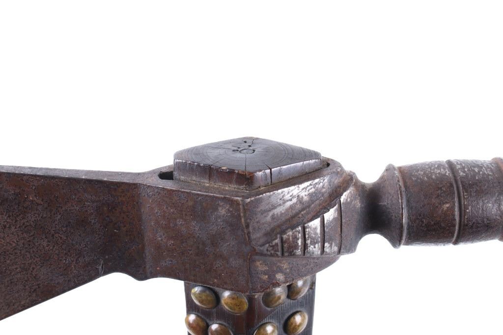 The lot features a Crow Native American Indian pipe tomahawk with fantastic beaded drop dating to Post-1900. The piece shows a cast iron head with typical triangular shaped blade having a small rear facing spur and weeping heart cutout at the center of the blade. The eyelet hole is diamond shaped and shows cast filed chevrons with filed lines with a beveled cast lined and filled line tall bowl with medium to thin walls. The head is secured to the solid wood haft with a hide gasket and the solid wood haft handle has a diamond faceted shape with median ridge running down the center with under cuts in the wood at the front with pointed center having a pierced hole which would have held a drop of feathers. The gripping area is also cut in and is finished by the pierced hole with hide tie and carved wood smoking tip. The haft is accented by deep hot file burned bands down the entire surface and further accented by brass trade tacks, with round shanks thought to be a later addition. The beaded drop is very large and impressive showing a trade muslin canvas covered in trade clothe with red and green stroud edges having the entire front covered in early period correct glass trade seed beads in a typical Crow pattern. The beadwork has an hourglass pattern and is in colors of chalk white, cobalt, greasy yellow, greasy blue, Cheyenne pink, lilac, greasy green and greasy rose. The base of the drop shows long hand cut Indian tanned hide which has a nice yellow ocher mineral pigment coloring and twisted finish. The drop is both trade thread and sinew sewn. Provenance: From a historic Eastern Montana American Indian Collection where the piece was found to be an authentic original, one of the finest collections of American Indian weaponry and antiquities in Montana. The piece measure 21”L with a head that is 8.75”L by 3.25”W blade by 1 5/8” thick. The beaded drop is 23”L with fringe by 5.25”W.
