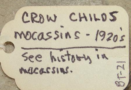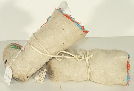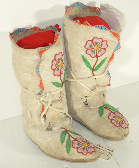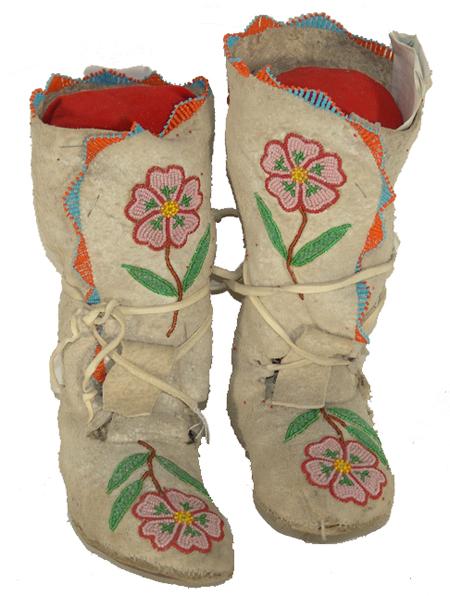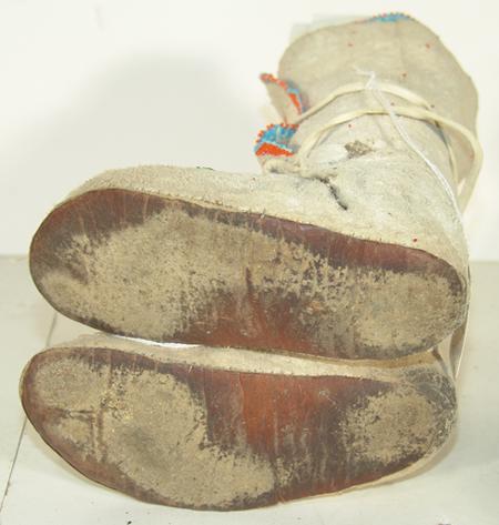 Rare pair of sinew sewn white buckskin girls' moccasins with hard soles and classic beaded floral motif. Condition: very good. 6x8 high.