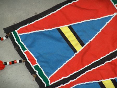 Ca. 1970s, Set of matching hand crafted heavy canvas cloth and beaded parade gear including bandolier, should strap, forehead rosette, and two stirrup covers. All in very good, usable condition. Standard