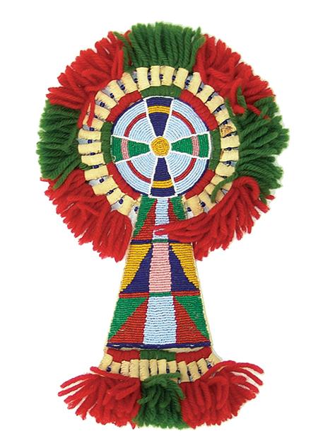 Circa Late 1900s, Classic design fully beaded "keyhole" forehead  rosette done on rawhide and fully beaded with Crow  motif.  Trimmed with red and green wool yarns.   Excellent condition.  (Matches above three lots  and lots #647 and #655.) 13-1/2" x 8"     From the Johnson Collection.