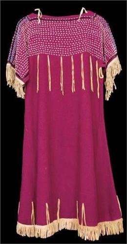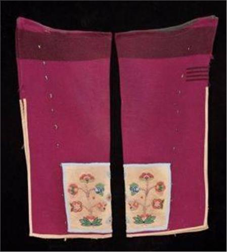 Crow Indian Dress Beaded on Trade Cloth. 45” long. Mid 20th century. Together with pair of Crow man's leggings made from same type of trade cloth. 34” long. c. 1900. Nice floral beaded designs on legging panels. (est $1,200-1,500)