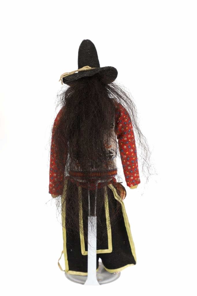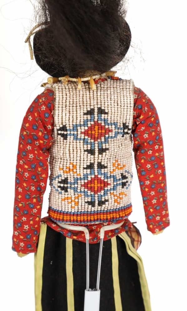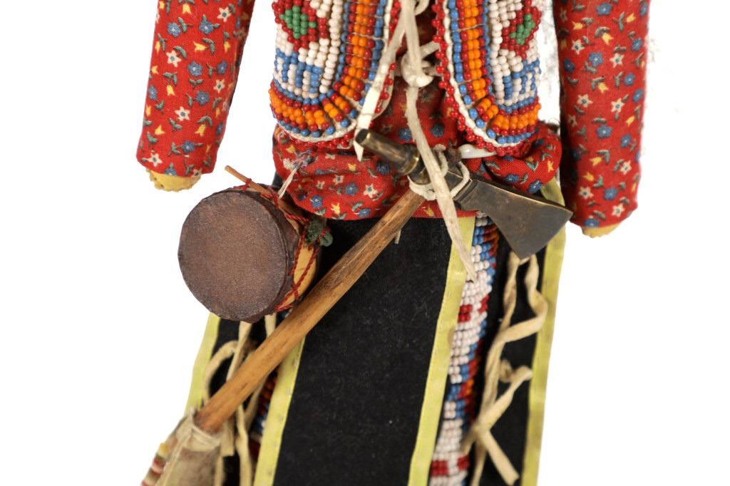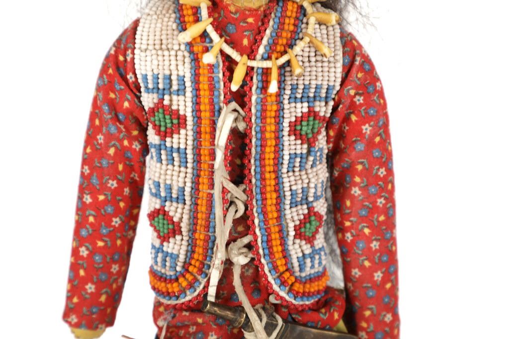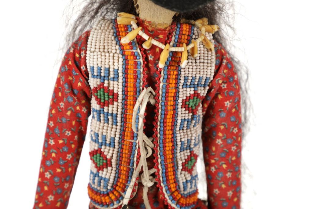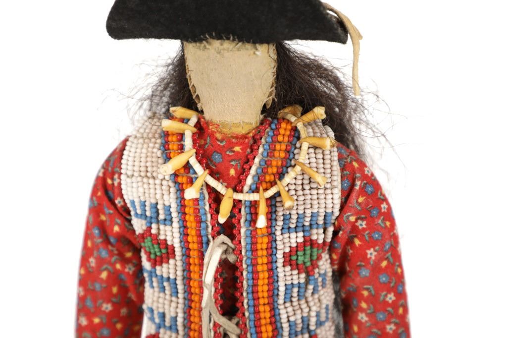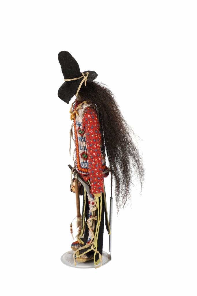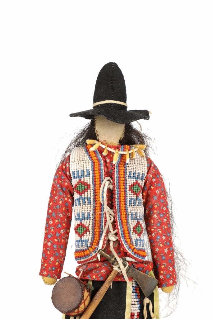 This is an exquisitely beaded Crow Indian Elder Doll from Montana dating to the late 20th Century. The doll exhibits Indian tanned hide with Great American Bison Buffalo hair showing a wool Crow Elder hat, floral calico shirt, full front and back beaded vest, real teeth and heishi shell necklace, brass pipe tomahawk with wooden haft and beaded and hair drop, drum with parfleche rawhide top and bottom and wooden construction, beaded dark blue or black wool stroud leggings with beadwork and beaded moccasins. The detail is wonderfully fine and the inclusion of the large pipe tomahawk in brass is truly amazing. Provenance: From a large collection of Native American Antiquities in Billings, Montana where it was found to be an authentic Crow example. Measures overall 12”H by 5.5”W by 4”D.