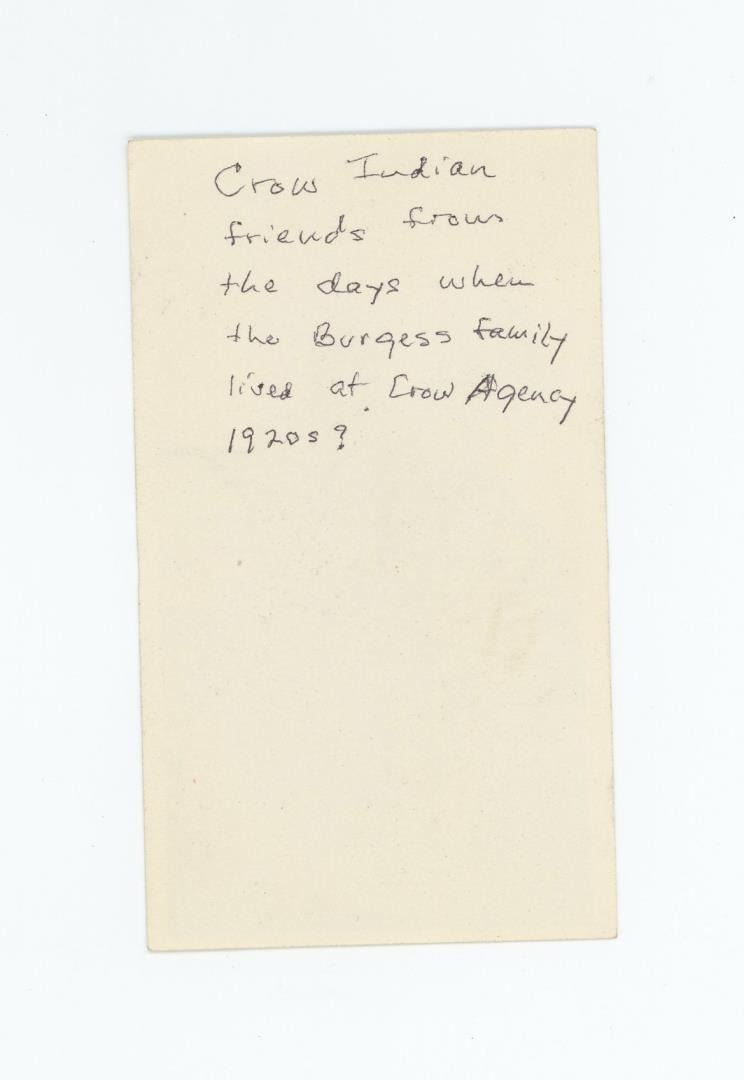Title on Back: Crow Indian friends from the days when the Burgess family lived at Crow Agency 1920s. 2 1/2" by 4 1/8". Provenance: Aline Natalie Burgess Claremont Los Angeles, daughter of James Gregor Burgess builder of the Burgess Baptist Church Crow Agency Montana, through Decent.