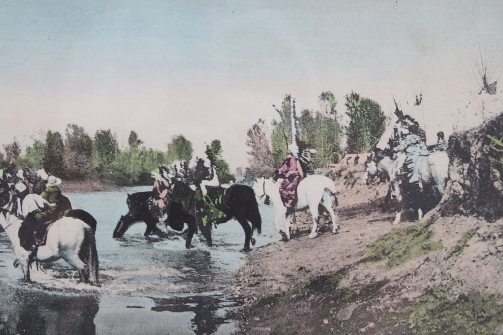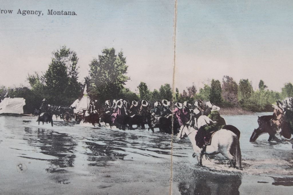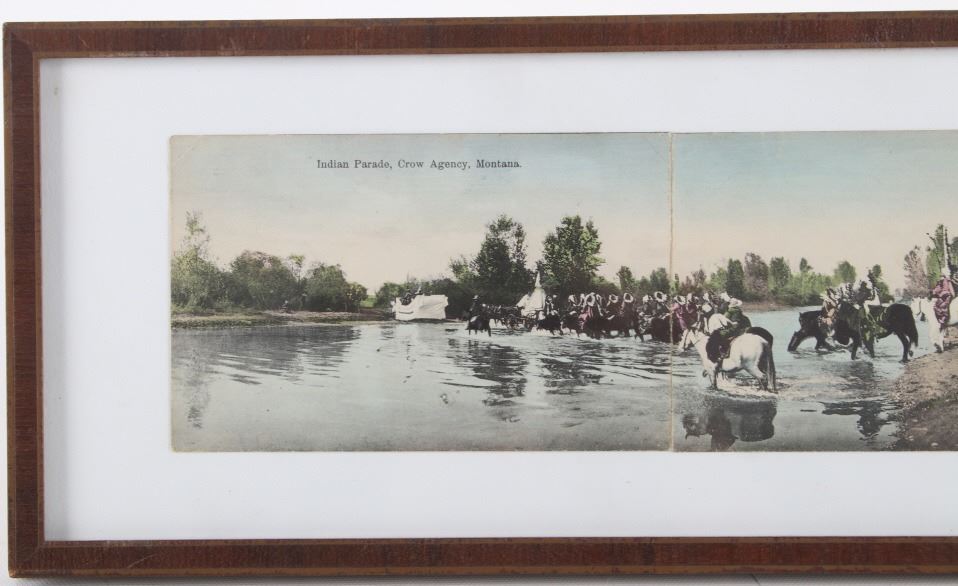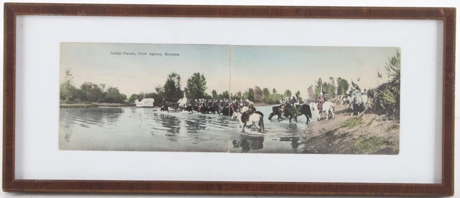 Featured in this lot is this double-sided postcard of a Crow Indian parade crossing Little Bighorn River near the Crow agency, Montana. This is a chromo lithograph double-sided postcard with a scene of Indian riders crossing the Little Bighorn River. The condition of this framed double-sided postcard is good and well preserved in a display case, but the frame shows slight wear. The measurements of this framed postcard are 6" x 14 3/8" and the visible art measures 3 3/8" x 11".
