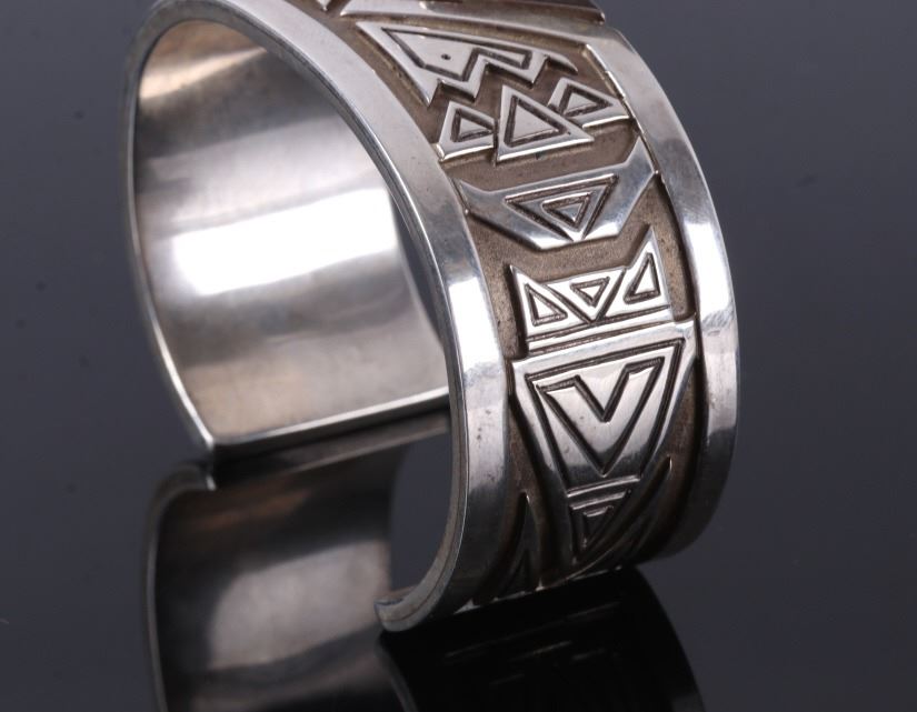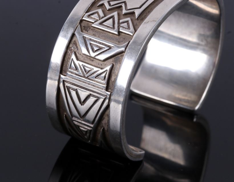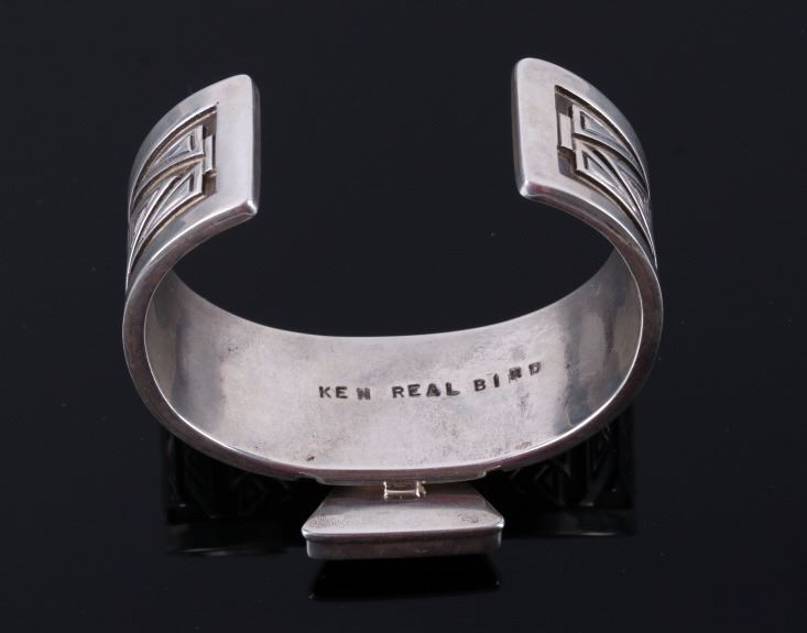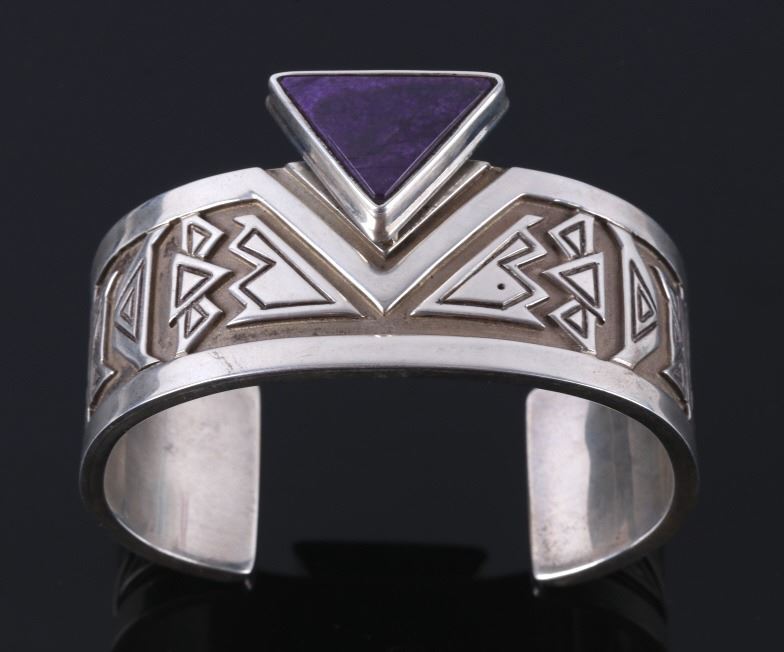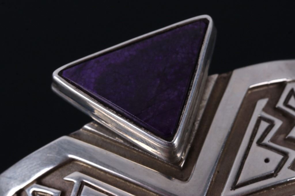 For your consideration is an original Ken Real Bird Crow Native American sterling silver and sugalite bracelet. Ken Real Bird is a member of the Crow tribe called the Apsáalooke in their own language. This tribe historically lived in the Yellowstone River valley and now reside on a reservation south of Billings MT. This bracelet features a gorgeous design throughout the band. The focal point of the cuff is a large triangular cut sugalite gemstone. The backside of the bracelet is marked with the artist Ken Real Birds name attributing to the 92.5% silver purity. The interior diameter of the bracelet measures 6 ½”.