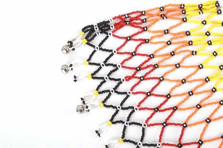 The lot features a beautiful lattice beaded woman's collar from the Crow Indians of Montana dating to circa 1960-1970's. The piece shows a criss-cross lattice pattern which is truly intricate and beautiful with trade fabric collar and ribbon ties. The collar shows three beaded medallions down the center showing Thunderbird patterns and across the bottom metal bells. The beads are all glass trade beads showing colors of white, orange, black, red and yellow. The piece displays beautifully and is well kept showing good condition.. Measures 38"W by 16"H.
