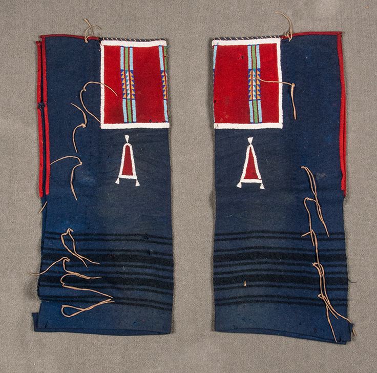 Crow Man's Panel Style Leggings. 30 ½" x 13" at widest point. Finely beaded panels on thick, blue trade cloth. Early 20th century.